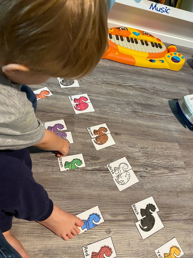 –Dinosaur color puzzles: I printed, laminated and cut out these cute dinosaur color puzzles on Teachers Pay Teachers. Then I placed all the head pieces on the floor and gave my little the tail pieces one by one. I asked him to find the _____ colored dino and put his tail on for each puzzle.
