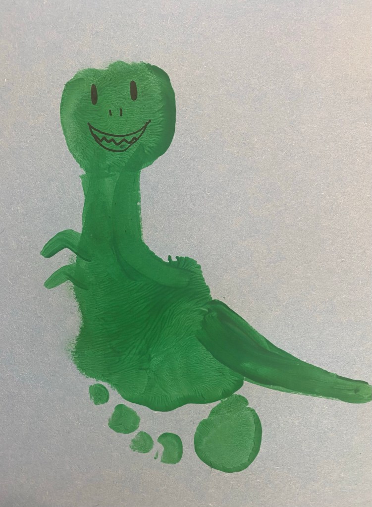 –T-rex footprint painting: Have your little choose a color for their T-rex, paint their foot and make a print on light blue or white paper. Add a big tail near the toes and some tiny arms on the opposite side near the heel. When it’s dry, draw on a face and you have a cute little T-rex!