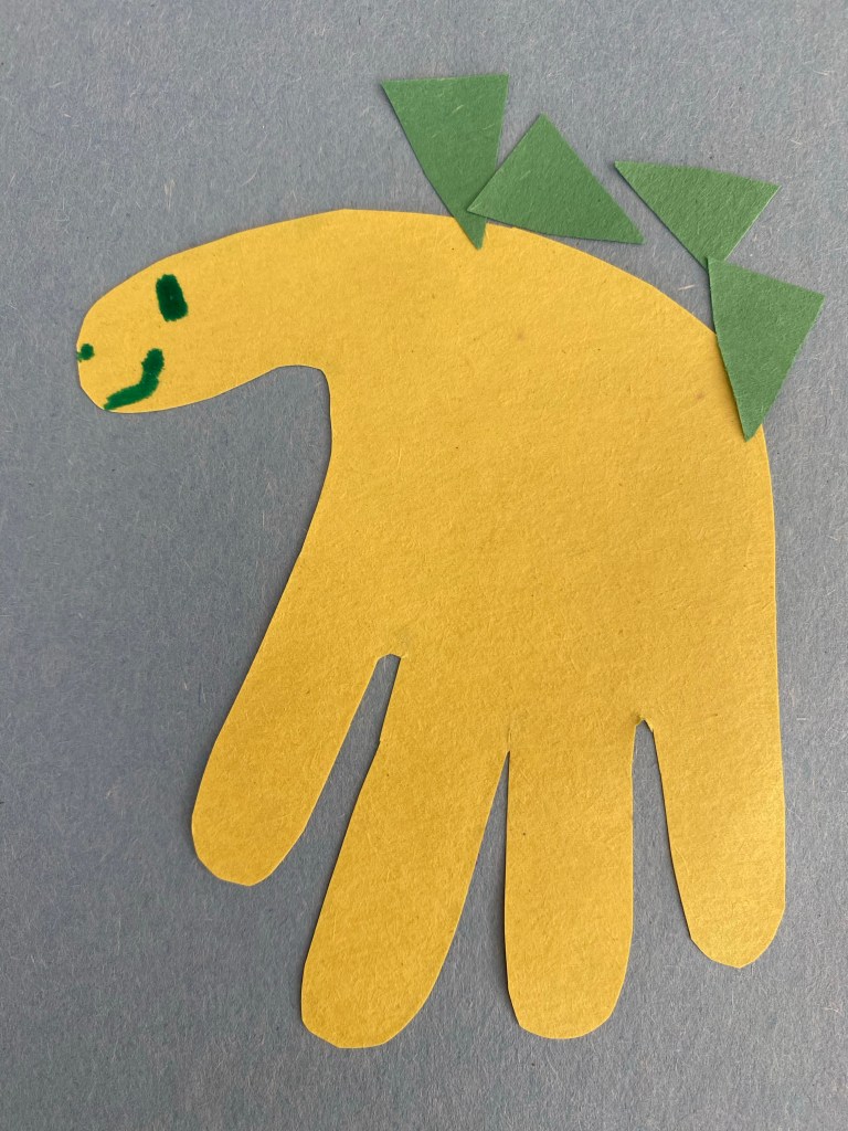 –Dinosaur handprint craft: Trace your little’s hand on a piece of construction paper and cut it out (or if they’re able to, have them cut it out). Have them glue the dino to a sheet of paper, add some triangles for spikes, draw some scenery and give their dino a name!