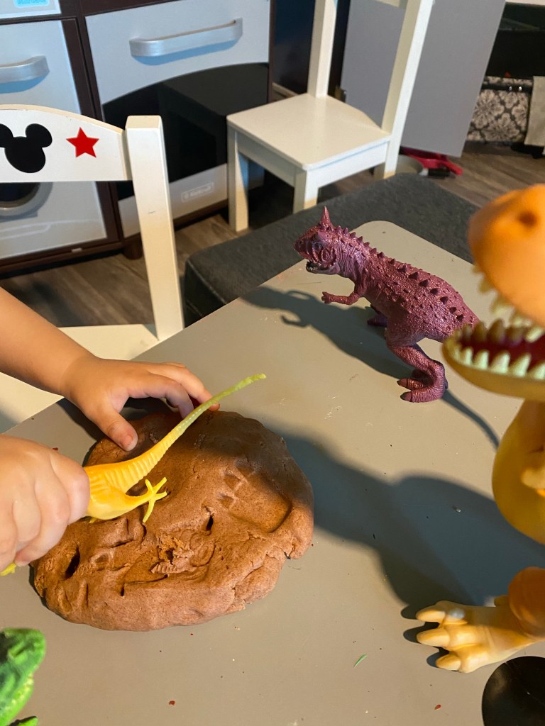 –Playdough dinosaur fossils: This one engaged my toddler for a good 45 minutes! He didn’t do dinosaur prints the whole time- but boy does he love this playdough! LoL It’s a recipe I made and shared on my Apples, Apples, Apples blog post this past fall and smells like apples and cinnamon so I pull it out whenever I get a chance! Plus it’s great for making fossils because it’s brown like dirt! Basically you just give your little the dough and some dinosaur figures and let them press the figures into the dough to see what the print will look like! With older littles you can talk about how fossils were made as they play- either by the animal leaving an impression in the hardening mud after it died and decayed, similar to these ones or by dying and their bones gradually being replaced with minerals over time.