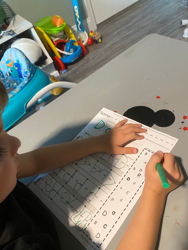 -D is for dinosaur handwriting practice: I printed this letter D practice page from Teachers Pay Teachers, then had my little practice writing while we reviewed the letter name over and over. I love that it also included a letter D hunt off to the side!