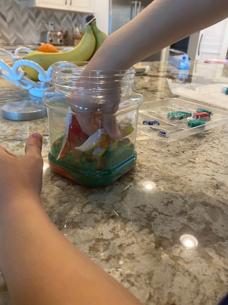 -Dinosaur habitat: My little got a fun make your own dinosaur terrarium kit for Christmas, so of course this was the perfect week to complete it! We talked about how the Earth looked when the dinosaurs were around, then I helped him make the dinosaur and accessories (volcano, palm tree) of out plaster of paris. He painted them, and put the terrarium together himself. You can get several kits on Amazon for around $20, or you can make your own using plants, dirt and rocks from outside along with an old peanut butter jar and some toy dinos!