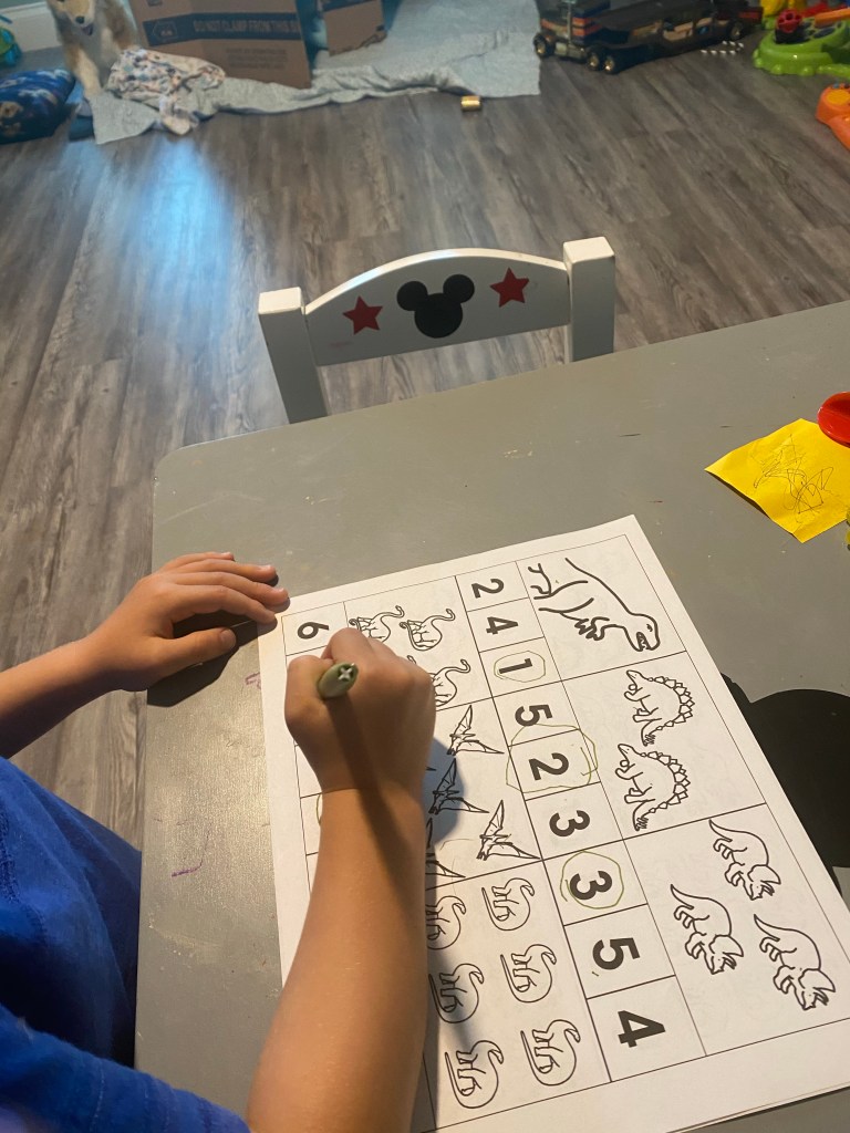 -Dinosaur count and find: I printed this dinosaur number recognition activity on Teachers Pay Teachers, then had my little count each group of dinosaurs and circle the matching number.