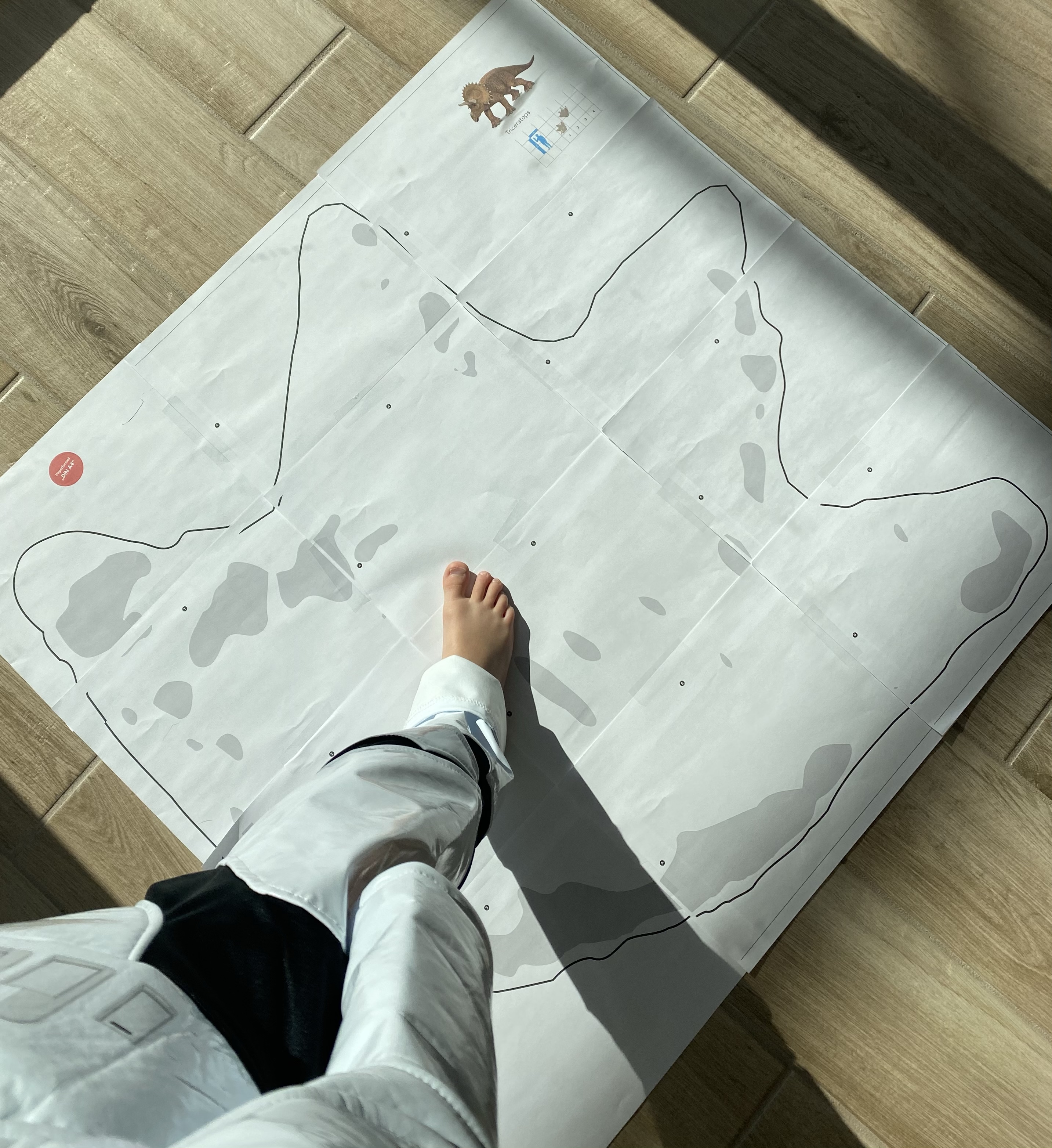 -How big were the dinosaurs activity: This is a MUST do activity from Frugal Fun for Boys– you guys, it was soooo cool! First, print and put together this life size Triceratops footprint on your floor (it’s 12 pages, but doesn’t use a lot of ink). Have your little compare their own footprint to the Triceratops one by placing their foot inside it, counting how many steps it takes to get from side to side, and guessing how many of their footprints it would take to cover the whole Triceratops footprint then figuring it out by tracing their foot on construction paper and covering the Triceratops print with their footprints. Next, go outside and measure 90 feet (we had to measure 3 sets of 30 because our tape measure wouldn’t go that far!) Mark either end and have your little stand at one end and you stand at the other- that’s how big a Diplodocus was from head to tail! MIND blowing! Finally, cut out a 6-7 inch tooth and compare it to your teeth- that’s the size Tyrannosaurs Rex’s teeth were- yikes!