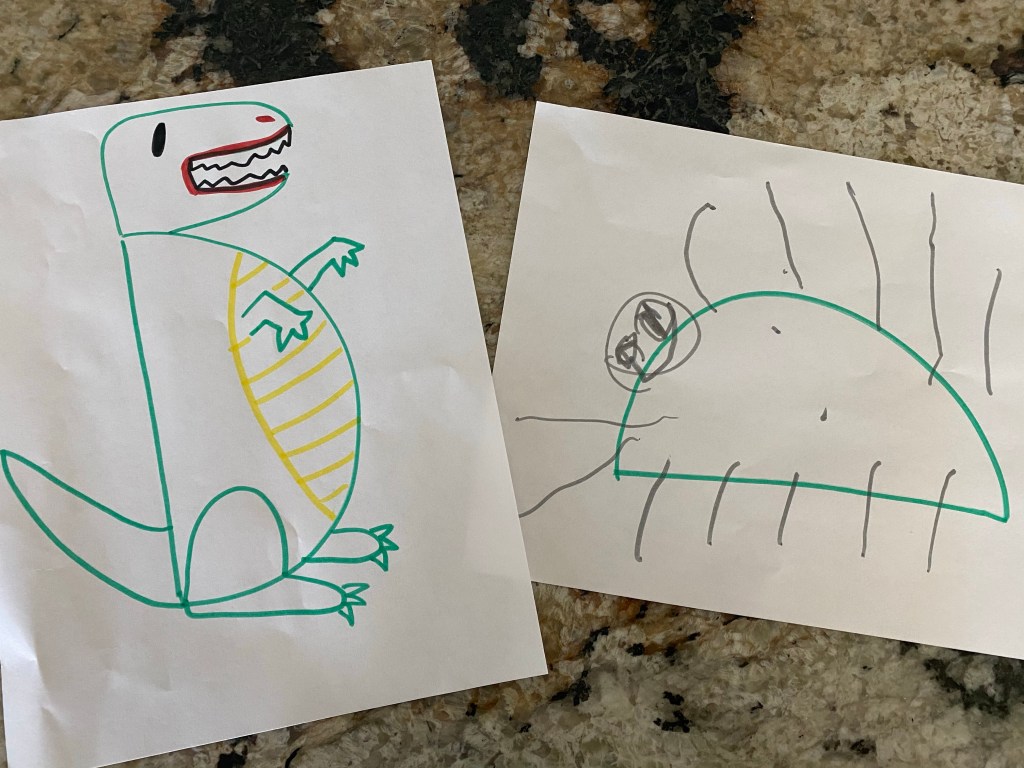 -D is for dinosaur drawing activity: I drew a large capital D on a sheet of paper, then told my little to add to it to make it into a dinosaur- I did one too because, hey, art is fun!