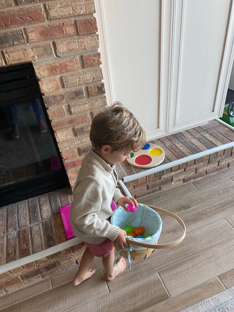 -Dinosaur egg hunt: Anything involving candy is a huge win in our house, so I knew this one would be a hit! I placed 2-4 Skittles in some Easter eggs we had on hand, hid them around the house, then had my little find them. When he had gathered them all up, he opened each egg and poured the candy into a pile. Then he counted the pile. (I told him he also had to split it equally with me since I was the one who cleaned up most of the toys earlier, which was a great lesson in division! LoL I asked him how he could split the group in half and be sure we both got the same amount and then let him figure it out.)