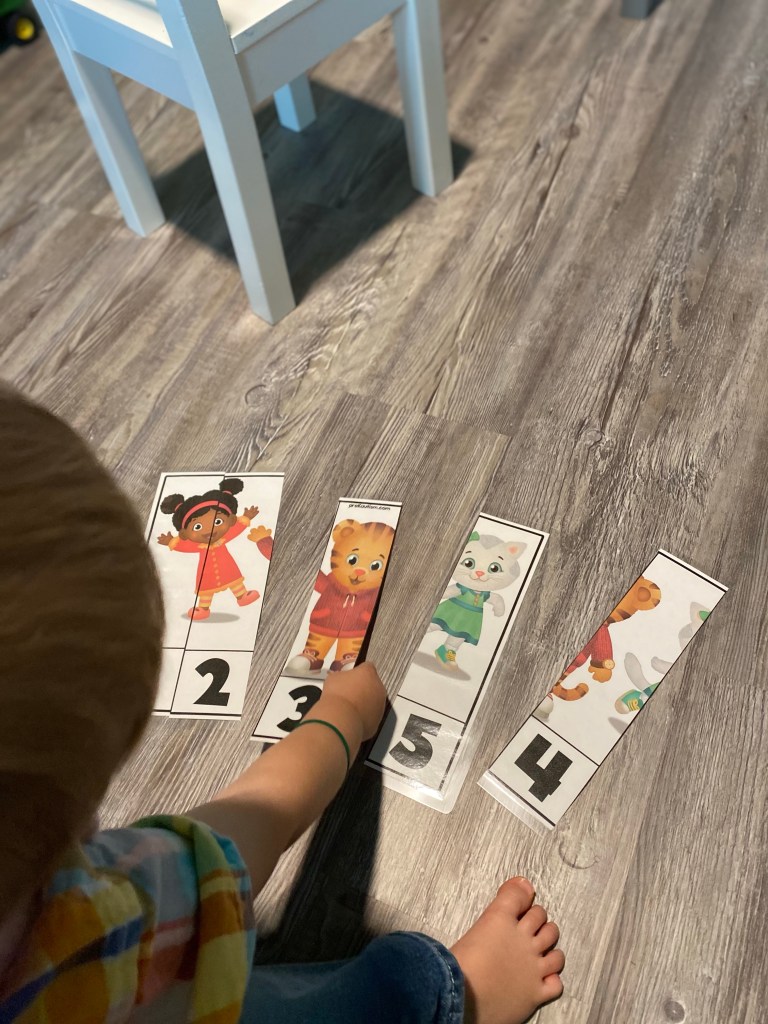 -Daniel Tiger character puzzles: I printed these Daniel Tiger character puzzles from CBC Parents then laminated them and cut them out. I gave my little 3 characters at a time then had him match the heads to the tummies and shoes- he loved it so much, he kept asking for “more” every time we finished a set!