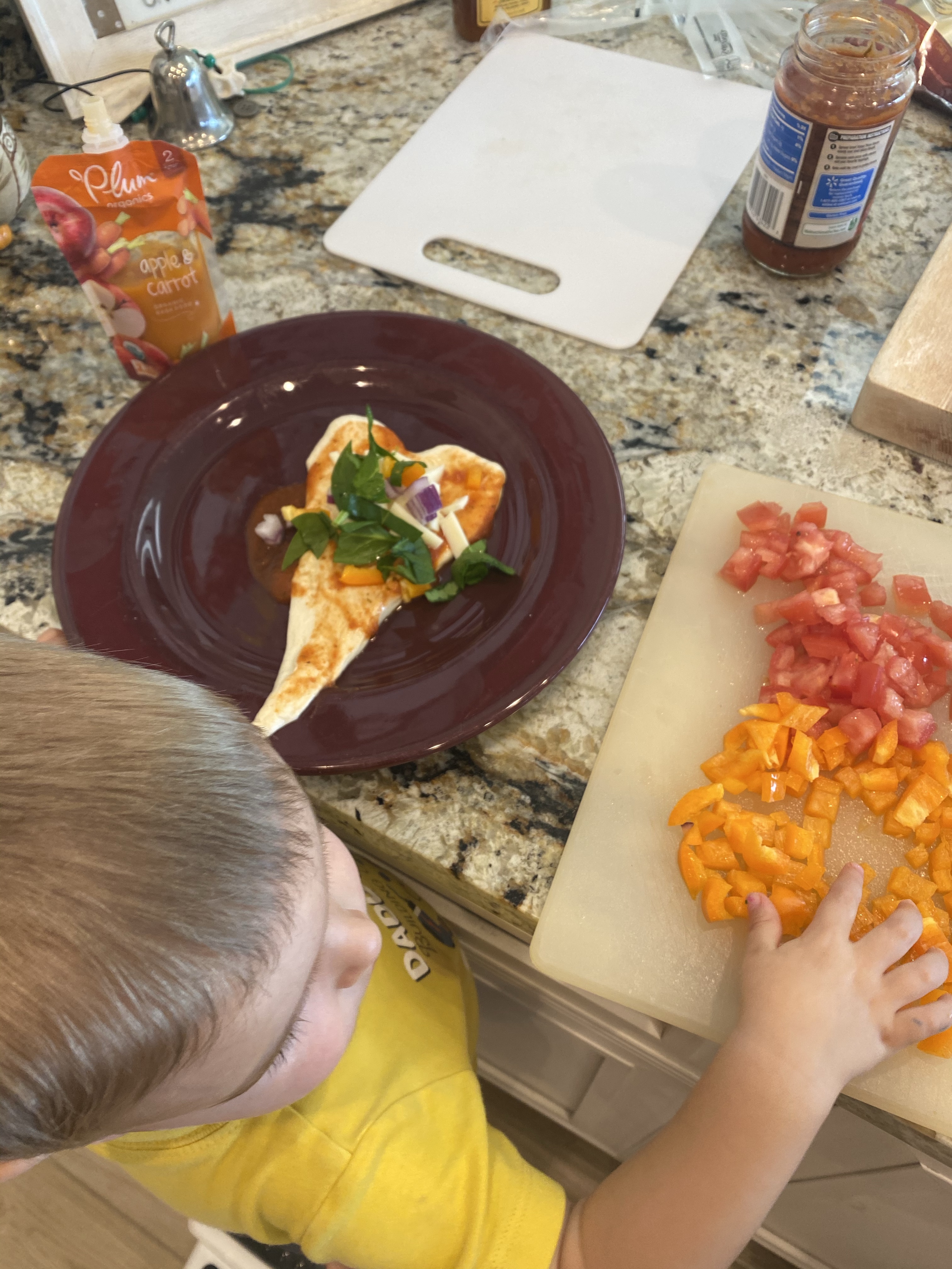 -Heart shaped pizza: Daniel Tiger is always whipping up something yummy in the kitchen with his mom, so we decided to make his rainbow veggie heart shaped pizza after reading “Happy Love Day Daniel Tiger”. There’s also a cute story in the first Daniel Tiger 5 Minute Stories book (highly recommended for any Daniel fan- it has 12 cute stories based on the show with sweet little lessons in each one!) where they make “Banana Swirl” (frozen then blended bananas) and “Veggie Spaghetti” (spaghetti with veggies scooped on top) that would be fun to try! To make the pizza, I bought some pre-made dough then cut it into heart shapes. I chopped up red tomatoes, orange peppers, green spinach and purple onions and had my littles make their own pizzas with the toppings. They came out super scrummy!