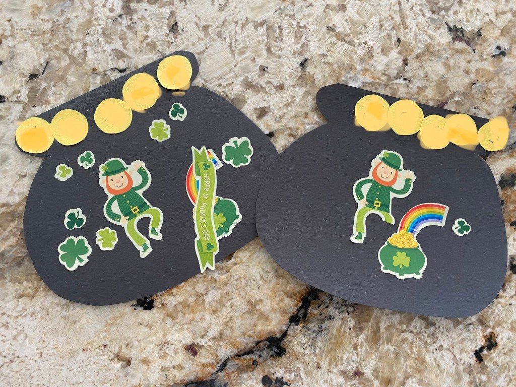 –Pot of gold name craft: I cut out a cauldron for each of my littles along with yellow circles- one for each letter in their name. I wrote the letters in the circles then had them glue them in the correct order at the top of their pot. (My preschooler did this unassisted, I guided my toddler by spreading out the letters then asking him if he could find each one in turn, then showing him where to glue it.) As a final touch, I let them decorate the pots with St. Patrick’s Day stickers. I got my inspiration from a Teachers Pay Teachers St. Patrick’s Day bundle posted on Pinterest.