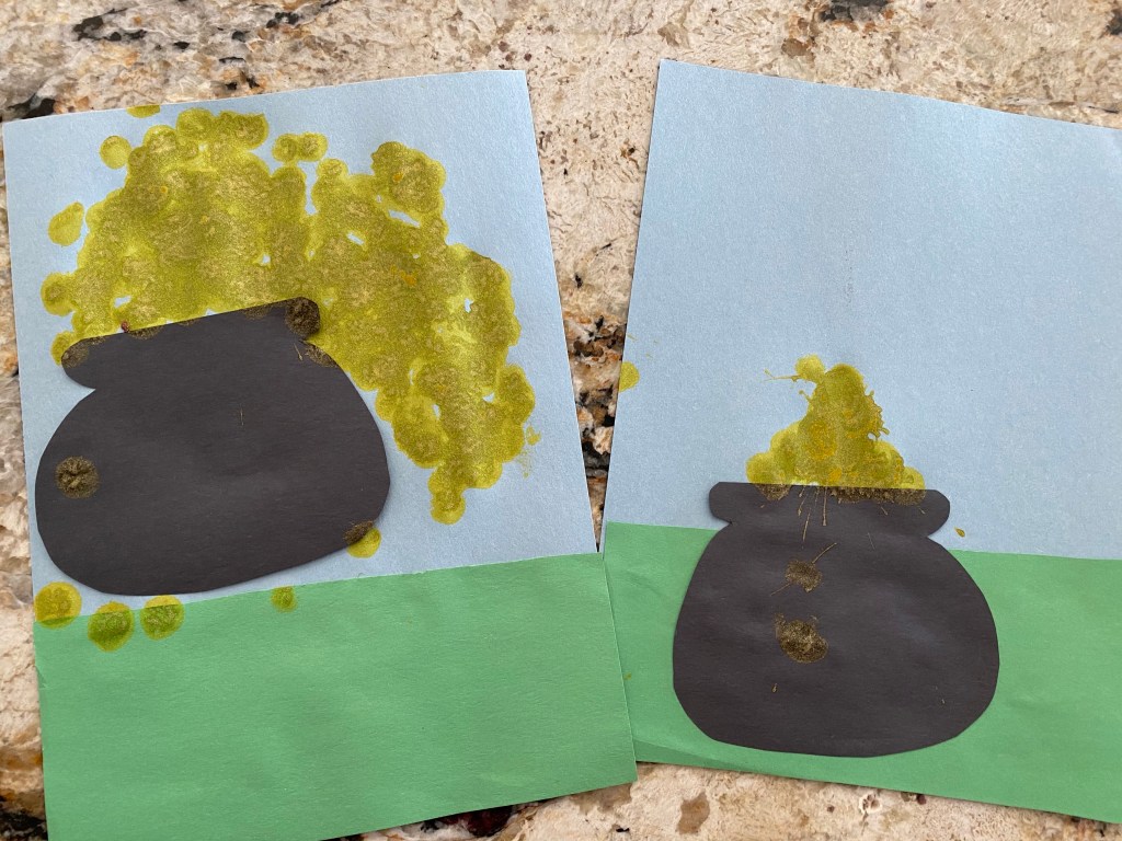 –Pot of gold dot art: Give your little a black cauldron cut out, a green rectangle (for grass) and a piece of light blue (or white) construction paper. Have them use glue to attach the grass and pot to the bottom of the blue paper. Then give them a shimmery bingo dobber to fill the pot with gold!