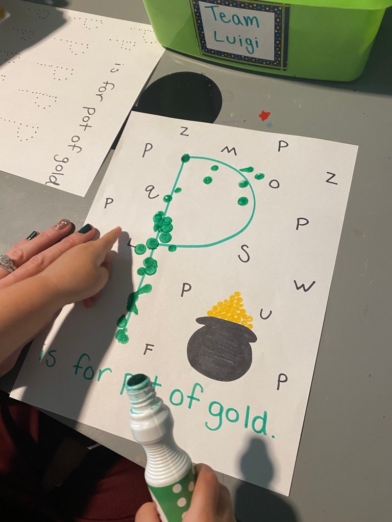 –P is for pot of gold: I made this “P” practice page by drawing a large P surrounded by some smaller letters (including lots of Ps) then had my little make a P by dotting it with a green do-a-dot marker. Then I had him dot the other Ps he found on the page. You could also do L is for leprechaun or S is for St. Patrick’s Day!
