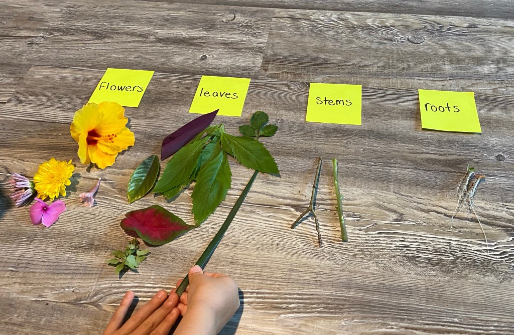 -Plant part sorting: I gave my little various plant parts from our yard, then had him sort them into the correct plant part they represented- flowers, leaves, stems or roots. Then we talked about what each part of the plant does to help the plant grow.