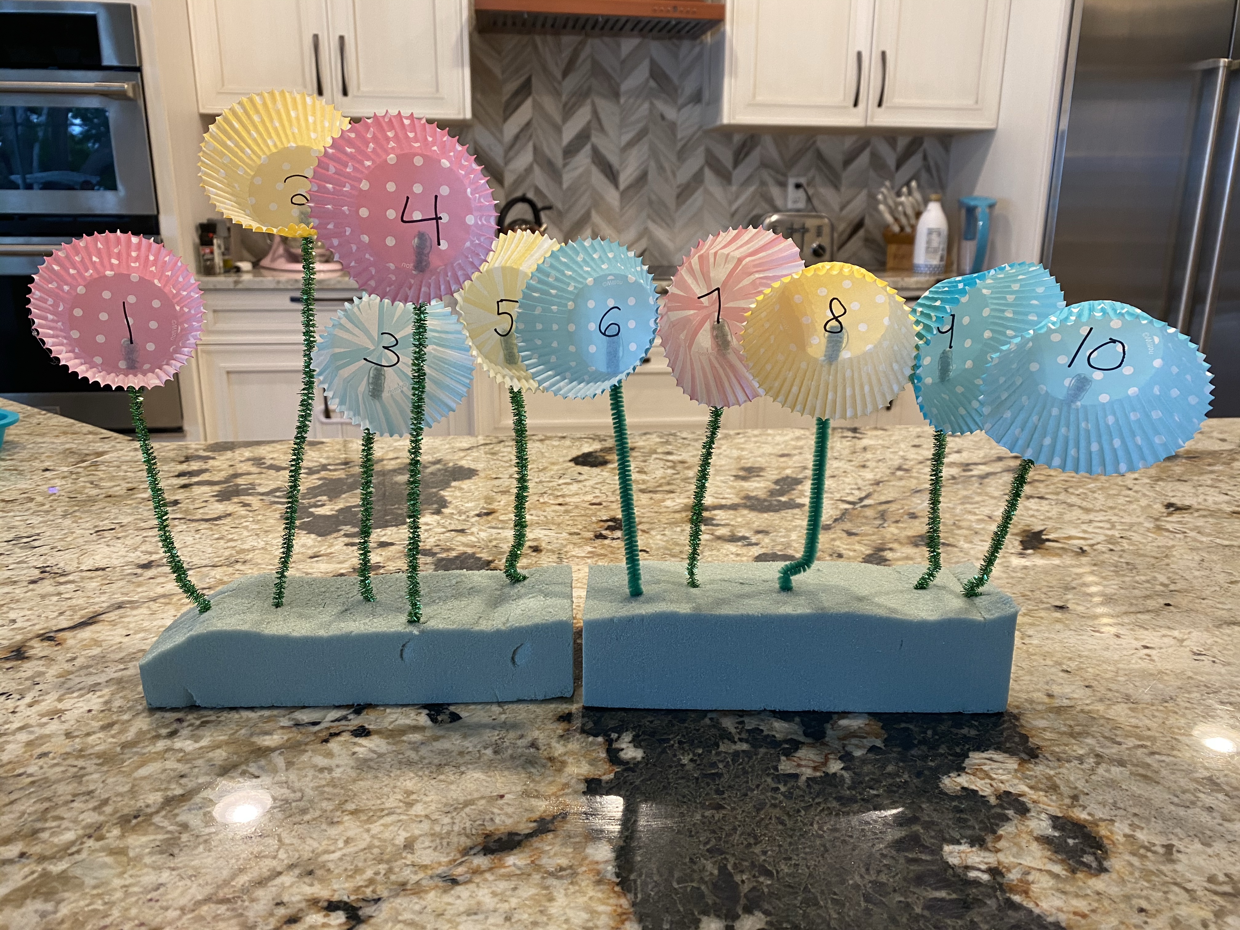 -Plant a number line: This activity was SO cute and fun, I knew my little would love it- and he did! You make flowers out of cupcake wrappers by writing the numbers 1-10 in their centers and hot gluing them to pipe cleaners or straws. Then give the flowers to your little out of order along with some floral foam and have them place the numbers in the foam in the correct order. This makes for a cute springtime decoration when you’re done too! I got the idea from 1 2 3 Homeschool 4 Me.