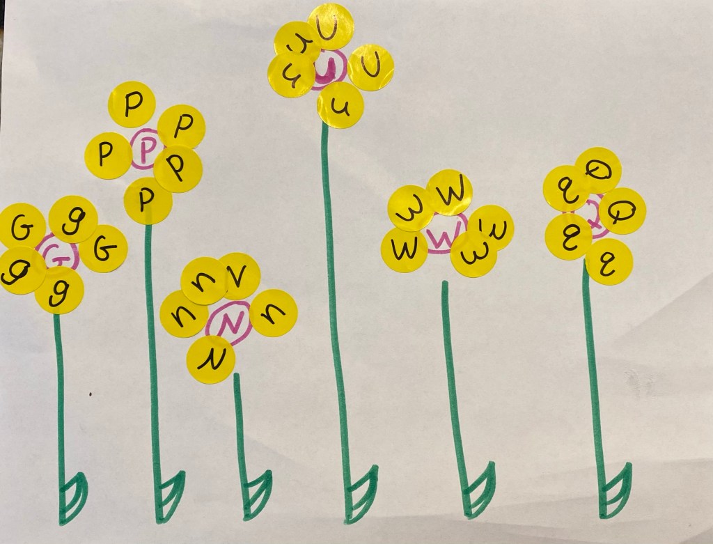 -Flower petal letter match: I saw this activity on Happy Tot Shelf and thought it was a fun way to practice letter recognition! I drew stems and flower centers for each of the letters my little is still working on mastering. I wrote the capital version of each letter in the center part of the flowers, then wrote 2 matching capital and 3 matching lowercase letters on dot stickers. I had him match the centers of the flowers with each dot sticker, placing the stickers around the center like flower petals. I also had him name each dot sticker letter as we worked since he knows the letter sounds, but is still working on some of the letter names. Since we did 12 letters, we did 6 one day and 6 the next.