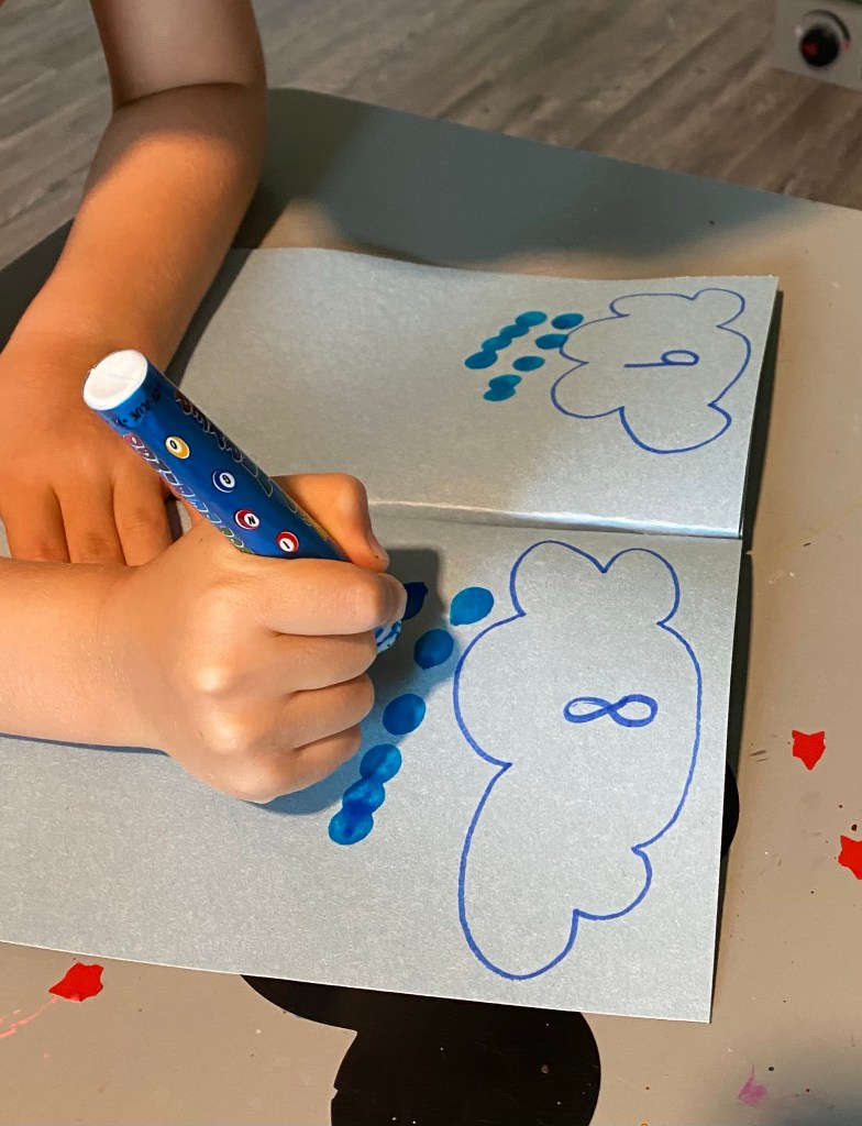 -April showers number recognition: I stapled 2 sheets of construction paper together to make a book and drew clouds at the top of each page. I wrote the numbers my little is still working on in the clouds, then had him identify them and use a do-a-dot marker to make raindrops to match the number.