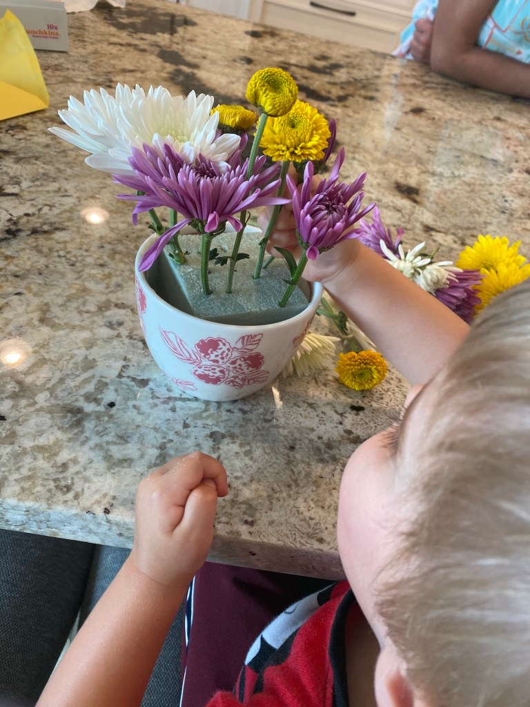 –Flower arranging: I actually got this idea from my neighbor Joan who happens to be a florist- she had a picture on her website of her grandkids arranging flowers and I was like “GENIUS!” LoL So anyway- I just tucked some floral foam into some old tea cups we had, then gave my littles several spring stems and let them poke them into the foam until they had a beautiful arrangement of flowers! We’re going to use them as centerpieces on our Easter table this Sunday!