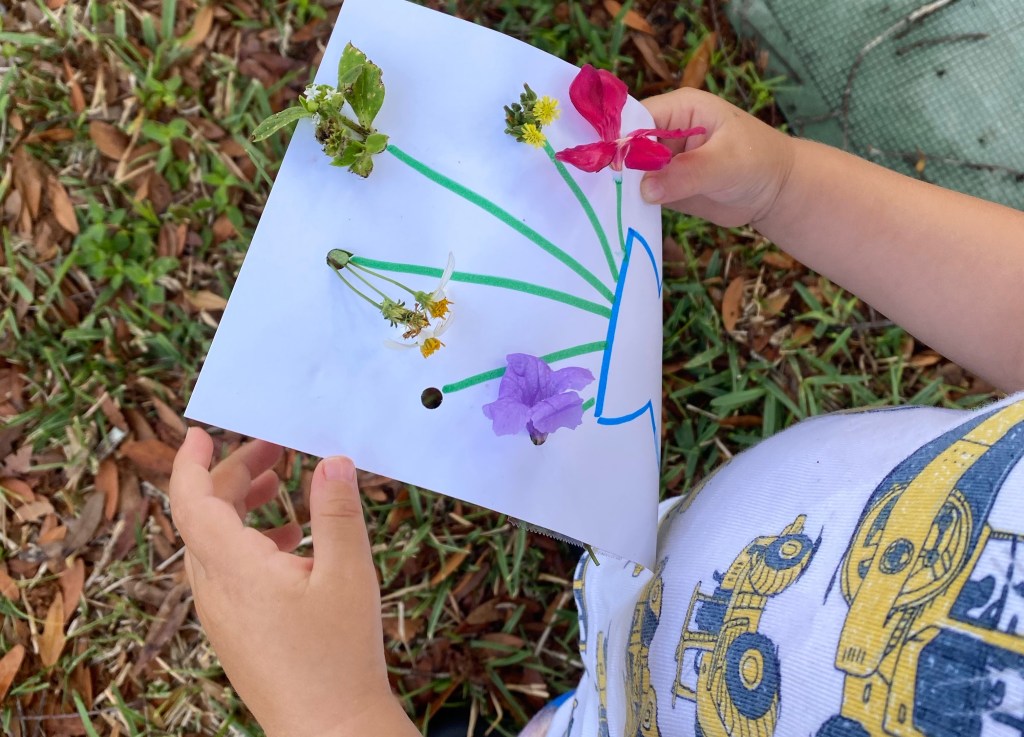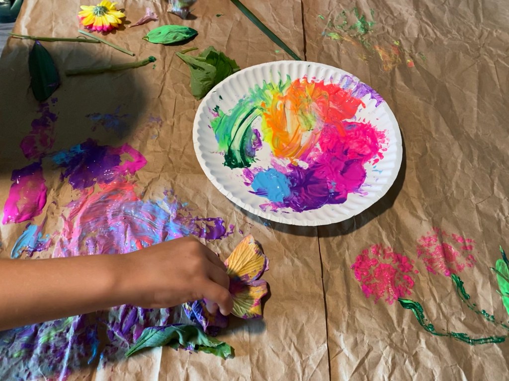 –Plant part process art: I love process art activities for littles because they truly develop artistic exploration and creativity. For this one I taped some brown paper we got as padding in a package (yay reusing!) to the little’s school table, then gave them various colors of paint and plant parts to paint with. Then I just let them explore!