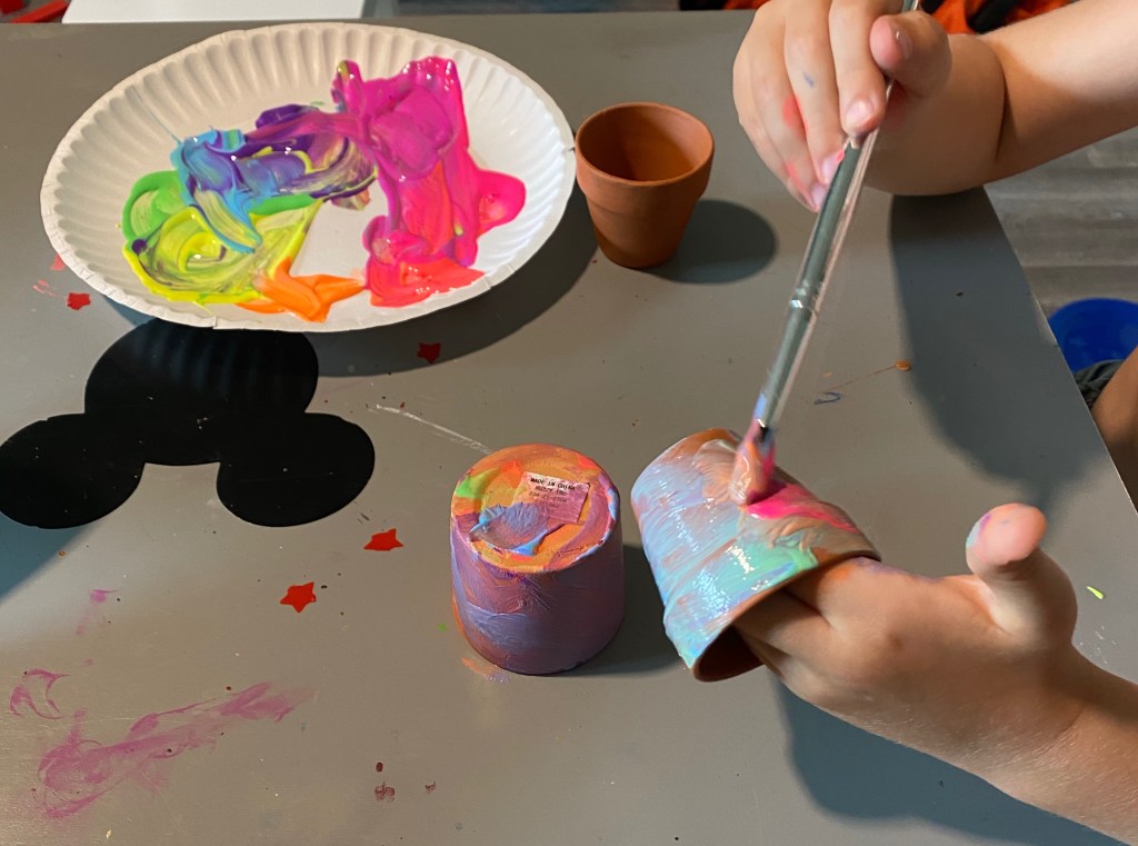 –Flower pot painting: I gave my littles each a flower pot to paint in cheerful spring colors! I decoupaged them when they were dry to protect the paint, then we filled them with dirt and planted flower seeds inside!
