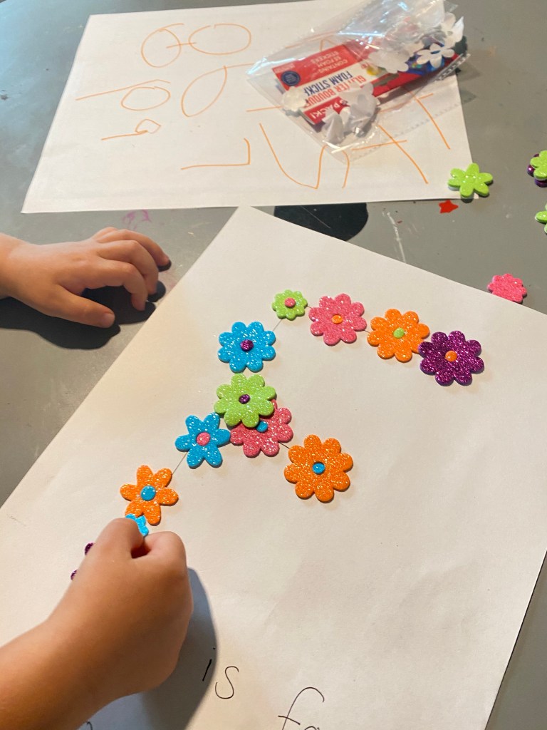 –F is for flower craft: I drew a large F on a piece of paper and had my little use flower stickers to cover the lines and make his own letter F!