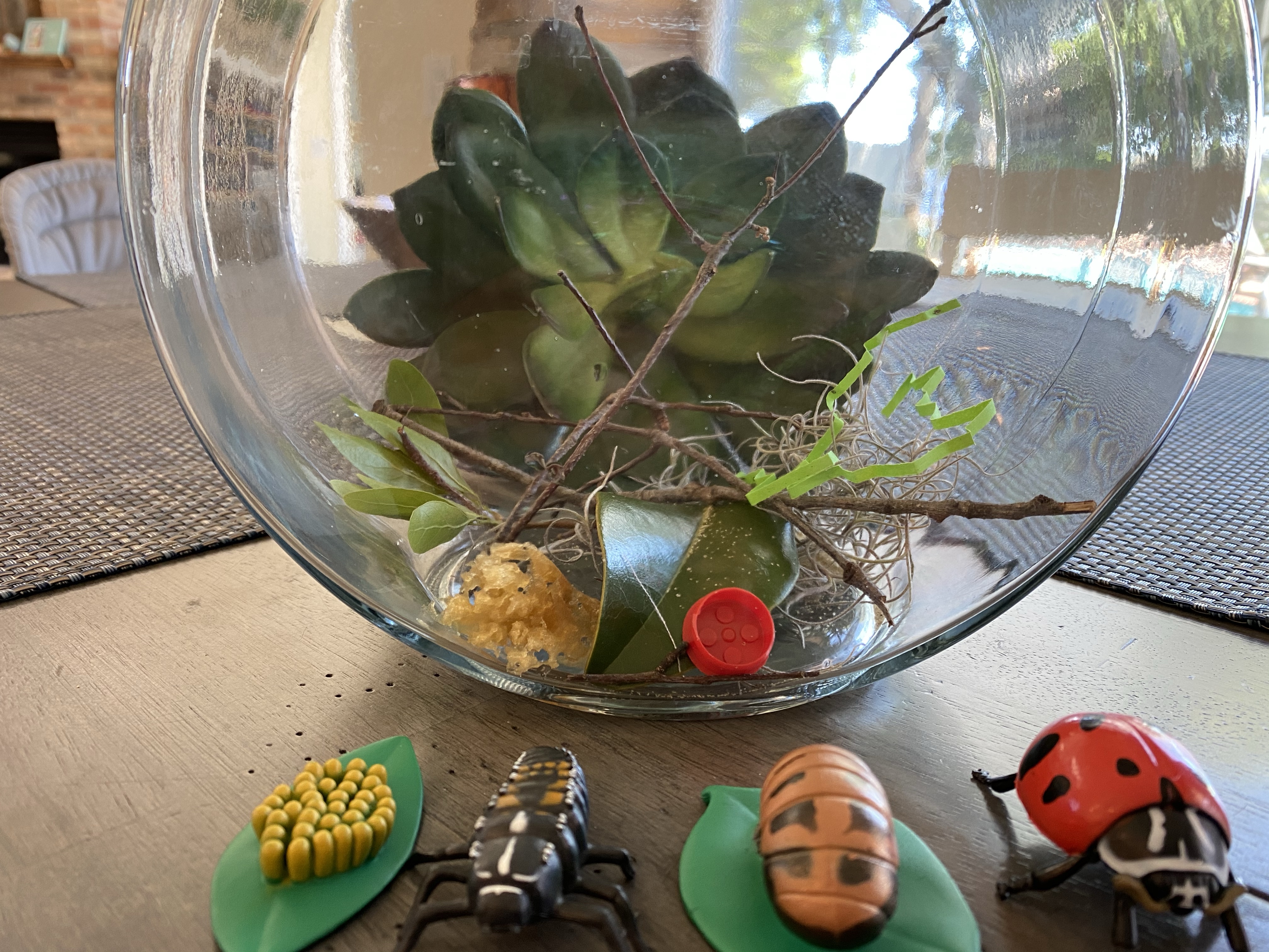 -Ladybug life cycle: Since the ladybug kit came with figurines depicting their life cycle, I read a nonfiction ladybug book to my littles then had my preschooler put the figures in order from egg to adult. Then I had him name each phase. If you decide not to get a kit, you can always do this with cards printed from the internet.