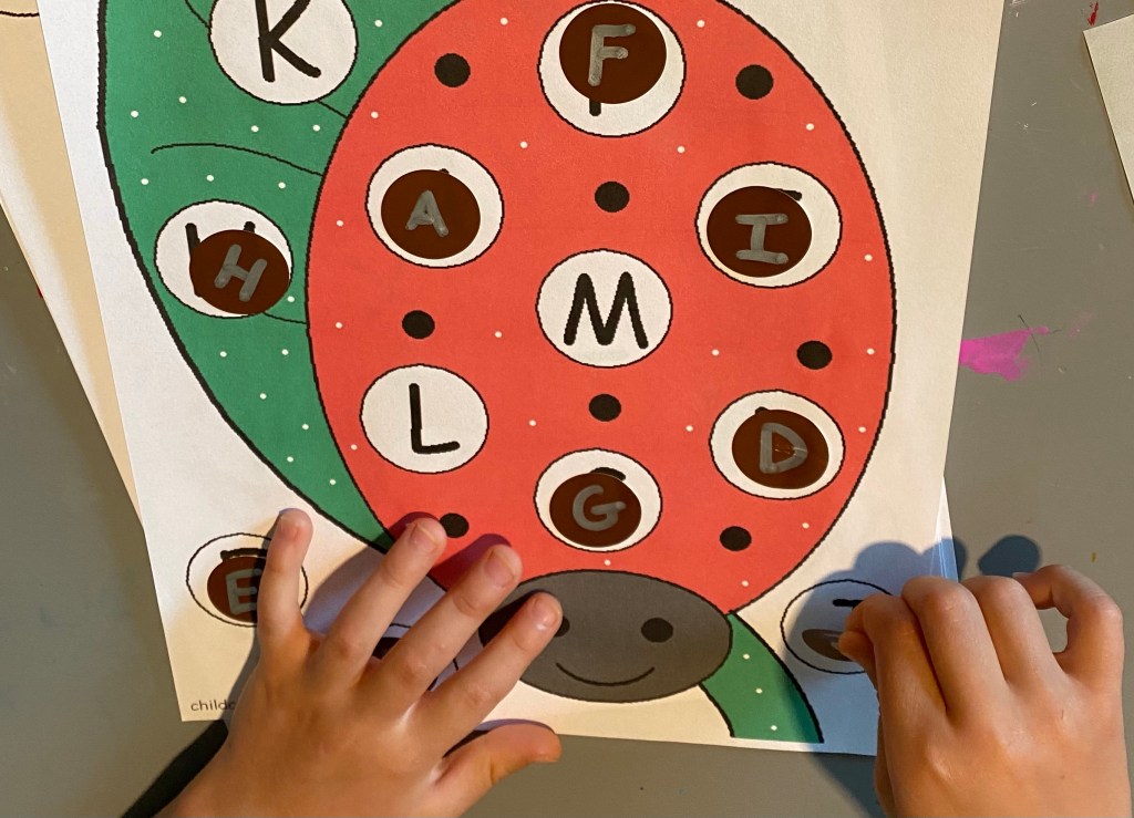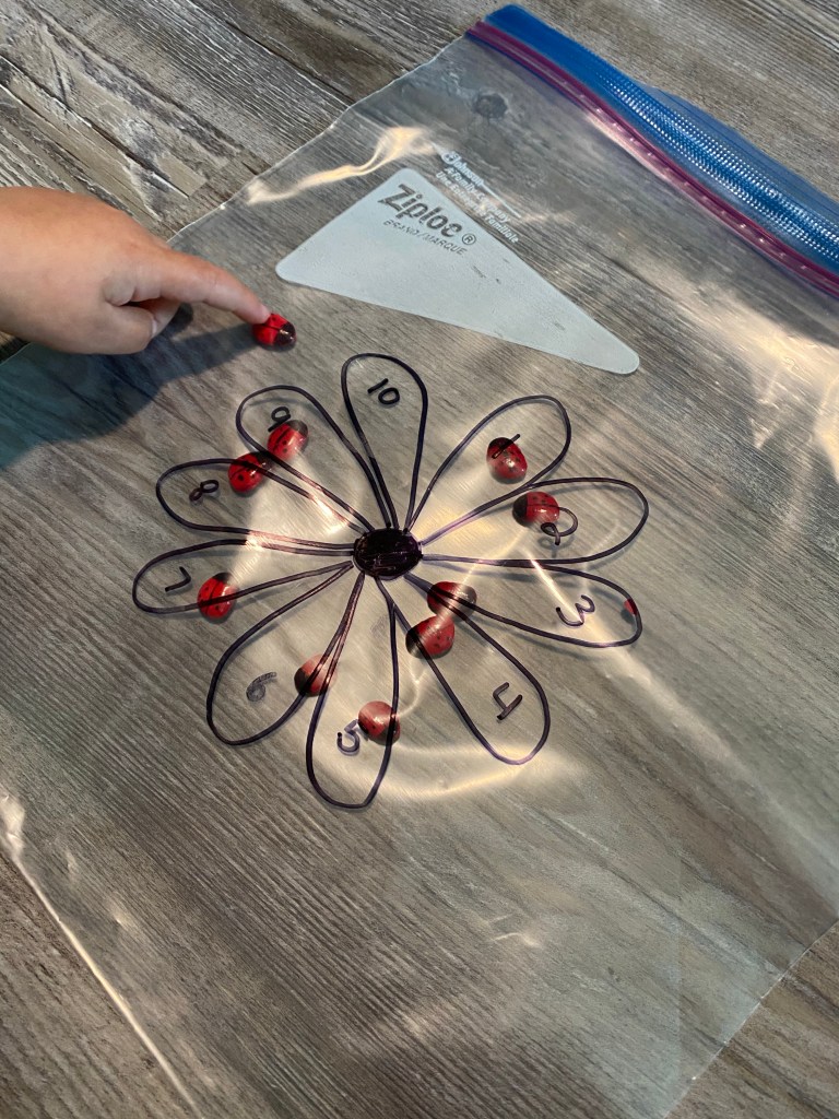 -Hands on Ladybug counting bag: My friend Lisa shared this activity with me from Crafty Moms on TikTok and though it took some prep work, it turned out so cute! I ended up not putting the oil in the bag because I wanted to save it for later and was worried about messy leaks- you can still move the ladies around just fine without it! To set this up, you just paint some beans red with nail polish. When it’s dry, decorate them to look like real ladybugs with a black Sharpie! Then draw a flower with 10 petals on a gallon Ziplock bag. Label the petals 1-10, then have your little scoot the ladybugs onto the petals while counting.