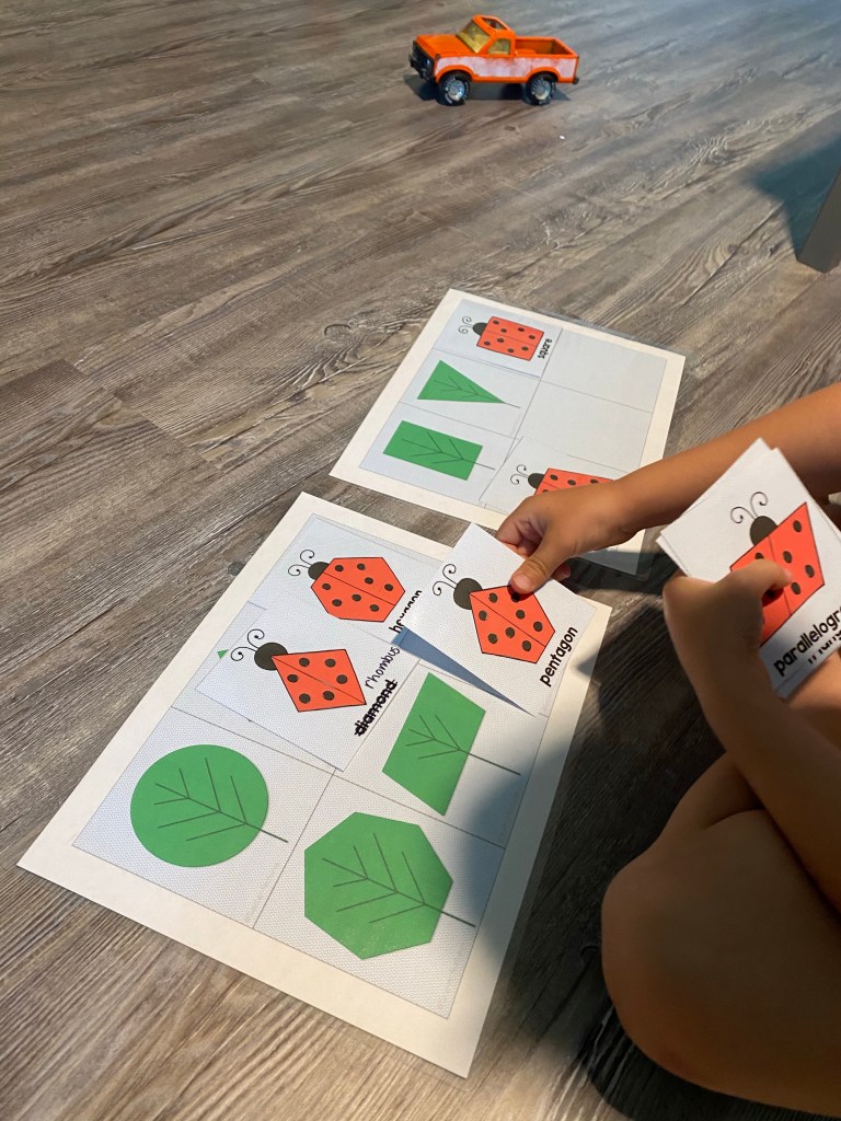 -Ladybug shapes: I printed this ladybug shape match activity from Teachers Pay Teachers, laminated it, then cut out the ladybug pieces. I had my little name each shape, then match it to the coordinating tree. Note: The pages label the rhombus as a diamond- this only creates confusion when kids get to school. As I would tell my 3rd graders- a diamond is a rock, a rhombus is a shape. I relabeled it and I encourage you to do the same! The word rhombus is just as easy to remember!