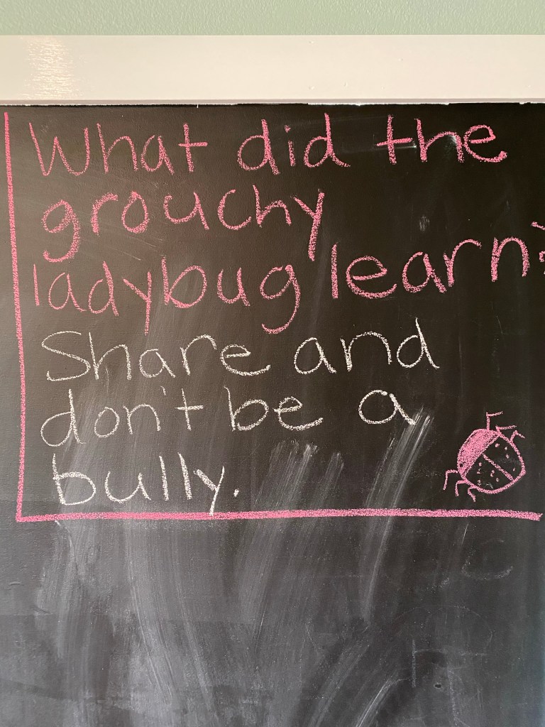 -“The Grouchy Ladybug” author’s message: We watched a reading of “The Grouchy Ladybug” on YouTube (I tried to get it from the library but it didn’t arrive on time so I improvised!) then talked about the story to determine the author’s message. I asked questions like “What did the ladybug keep doing over and over?” “Was that wise?” “What should the ladybug have done instead?” We also discussed bullying and how if you stand up to a bully, often they’ll back down- just like the ladybug!
