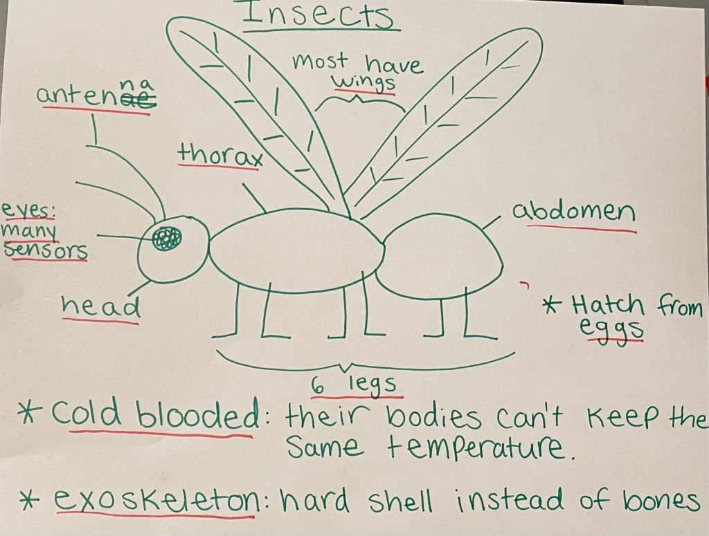 -What makes an insect: First we watched this short video clip on insects from YouTube. Then I drew a diagram of an insect (I chose a dragonfly since ladybug’s parts are sort of hidden by their outer shell) and had my little tell me what makes an animal an insect. I wrote down his answers on and around the diagram, depending on if they were related to a body part like having 6 legs or a trait like hatching from eggs.
