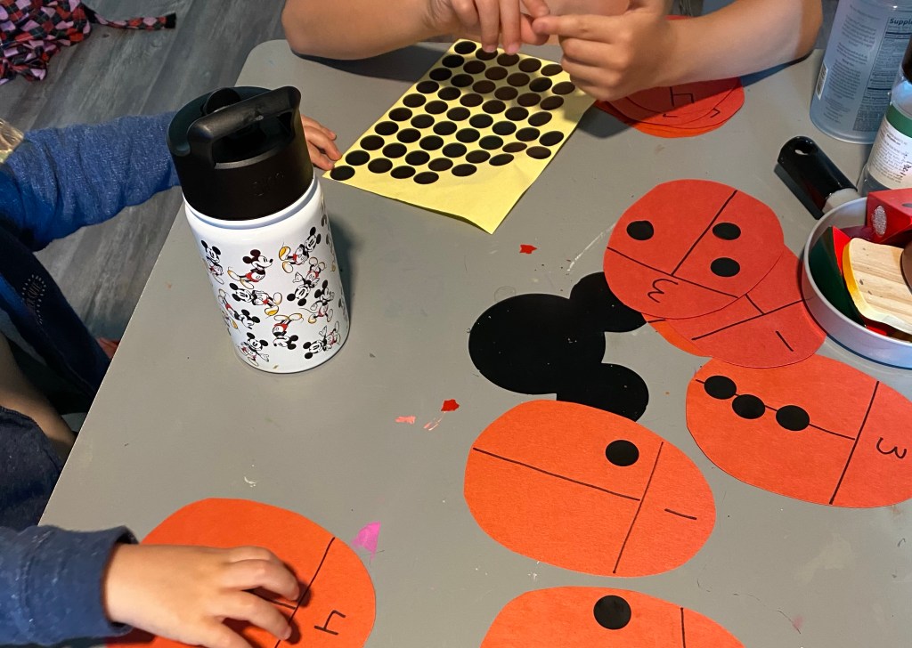 –Ladybug rock painting: First we went outside and I had my littles find some smooth, rounded rocks. Then they painted them red. When they were dry, I decorated my toddler’s rock to look like a ladybug using a black sharpie (my preschooler did his himself) and I decoupaged them so the paint would stay put. You can have your little hide the rocks in a park for someone to find- or they can keep them (or hide them in the house, which is what my littles chose to do! LoL)