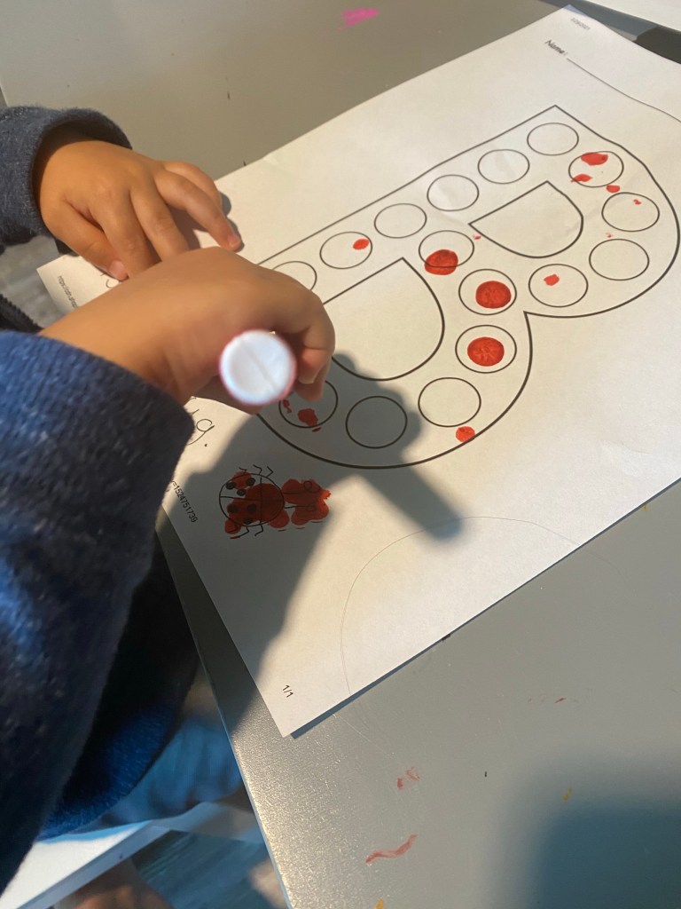 –B is for bug: I printed this letter B do a dot page, added a cute ladybug at the bottom, then had my little use a dot marker to make the B.