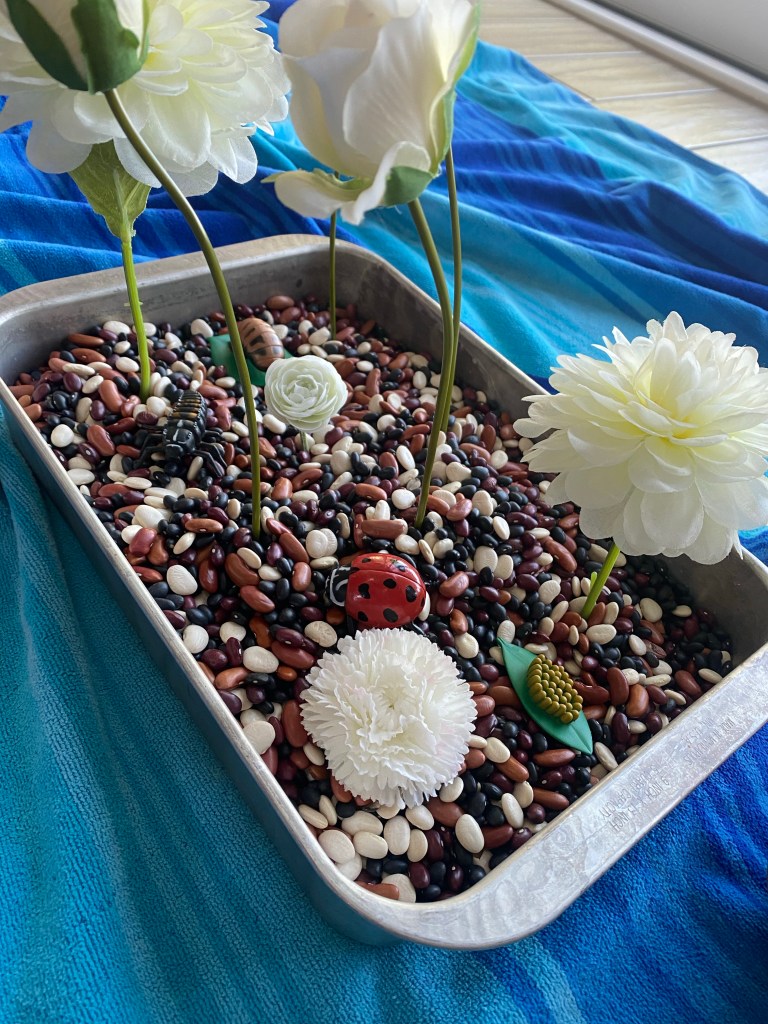 –Ladybug garden sensory bin: I set up a ladybug garden sensory bin for my littles to scoop and play in with dried beans, ladybug lifecycle figures, and flowers. You can even “plant” the flowers in the beans, which is fun!