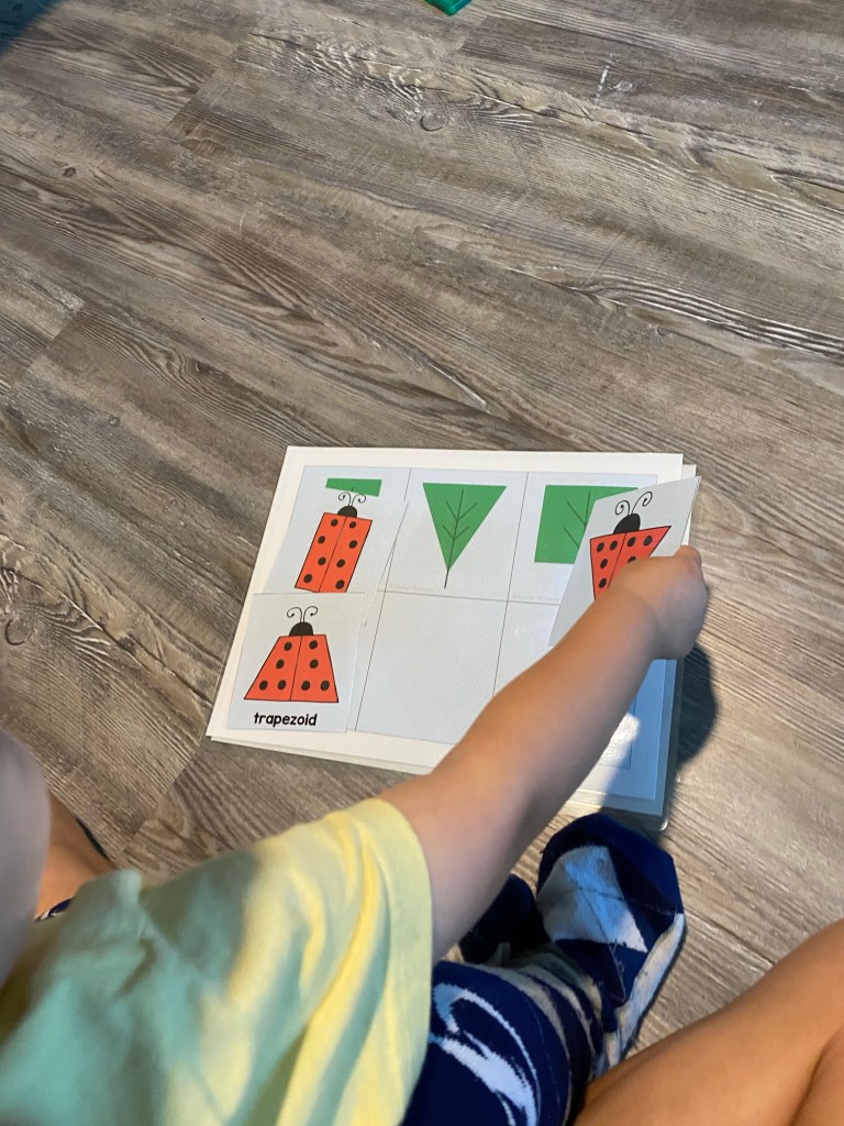 –Ladybug shape match: I printed a ladybug shape matching freebie from Teachers Pay Teachers, laminated it and cut out the ladies. Then I named each shape for my little and asked him where the matching tree was- for example, “This is a triangle- can you put the triangle ladybug on the triangle tree?” We worked on one page at a time so it would be a little easier for him to find the shapes. Note: The rhombus is labeled as a diamond on this activity. I highly recommend you change it to rhombus- as I used to tell my 3rd graders: a diamond is a rock, a rhombus is a shape. If littles learn it correctly now, they won’t have to relearn it later!