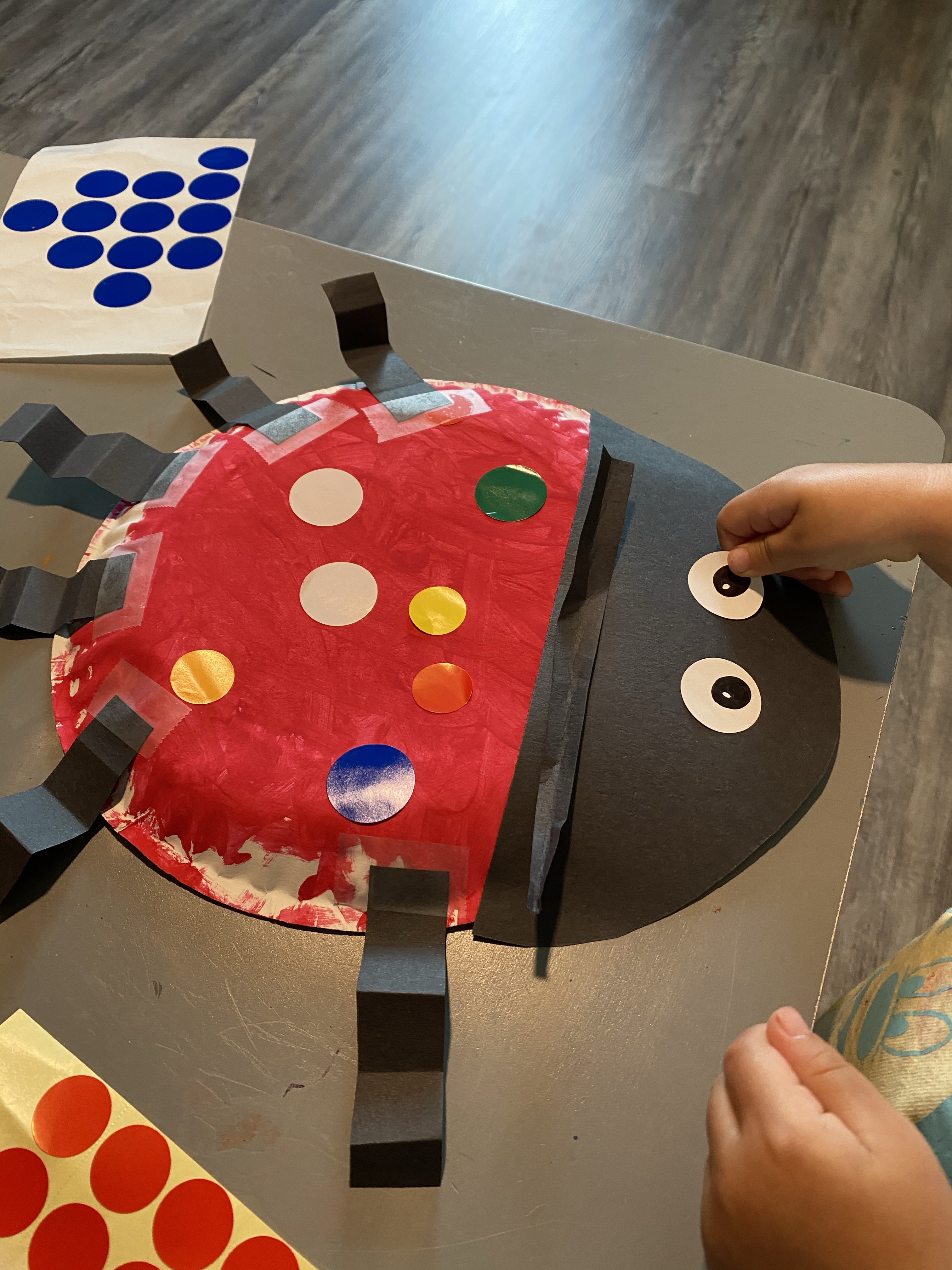 –Paper plate ladybug craft: We read the story “Lucy Ladybug”, then made Lucy using a paper plate and the instructions from Mrs. Plemon’s Kindergarten, with a few modifications. Basically, my littles painted the puffy side of paper plates red (like it was upside down compared with how you eat on them). Then after they dried I had them stick colorful dot stickers on their plates to make Lucy’s spots (in the story she has no spots, but borrows different colored spots from all her friends who willingly share with her- so sweet, right!?) Next we fan folded strips of black paper and the littles taped them on to make legs, along with a black half circle for Lucy’s head. My littles stuck on white dot stickers I decorated with a Sharpie for eyes as the finishing touch.
