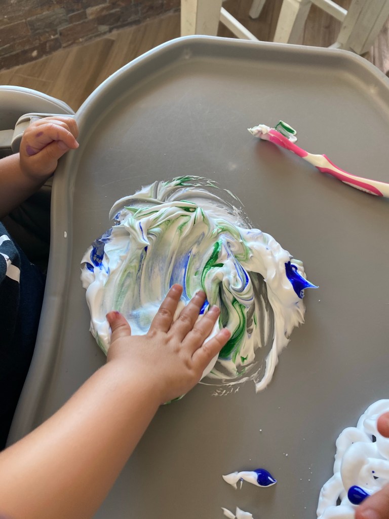 –Earth shaving cream sensory play: This is a 3 second set up and my littles had a blast with it! You just squirt some shaving cream on their high chair tray (or on a sheet pan), add some water based blue and green paint and let them squish and swirl their own planet Earth! You can also do this in a Ziplock baggie, but as we’re trying to steer clear of single use plastic, I figured it was more Earth friendly do just do it on the tray and wash it clean!