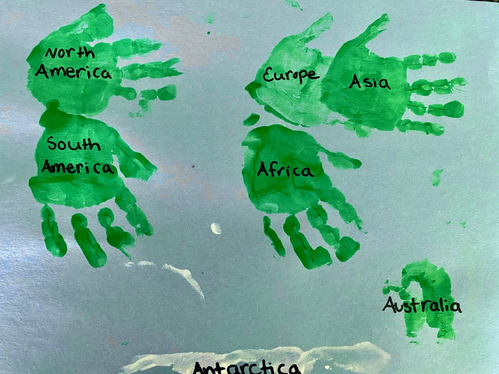 –Handprint world map: We used handprints on a sheet of blue paper to make a world map! Most continents were made by using palm prints but we did Antarctica by using a “karate chop” print (the side of their hand) and Australia by using a fist print (have them make a fist and paint the side of their hand opposite their thumb). When it was dry, I labeled the continents and showed them to my littles.