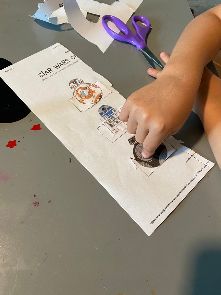 -Droid cutting practice: I don’t really like cutting practice pages- I feel like scissor practice should be something that is meaningful- like during craft creation. That being said, I really like this cutting practice page because it has a purpose (rather than random lines to follow). Your little cuts out the bottom halves of the droids and glues them to the top halves to make them complete! My little really enjoyed it! I got it from Simple Everyday Mom.
