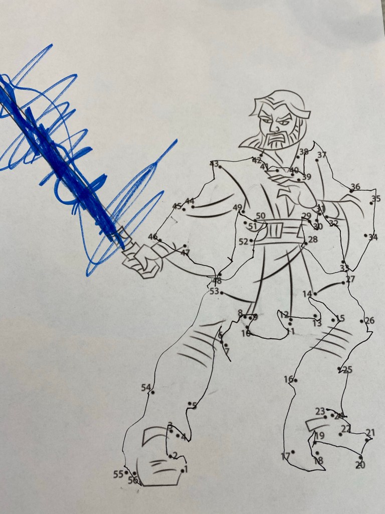 –Star Wars character connect the dots: I love doing connect the dots as counting/number recognition practice! Since my little still doesn’t know what larger numbers look like (and this one goes up to 56!) I point to the numbers as he connects them and counts. Afterwards he wanted to color it- he said the lightsaber is glowing- that’s why he scribbled to show the light- and Qui-Gon is covered in snow…which is why he only colored the light saber. LoL