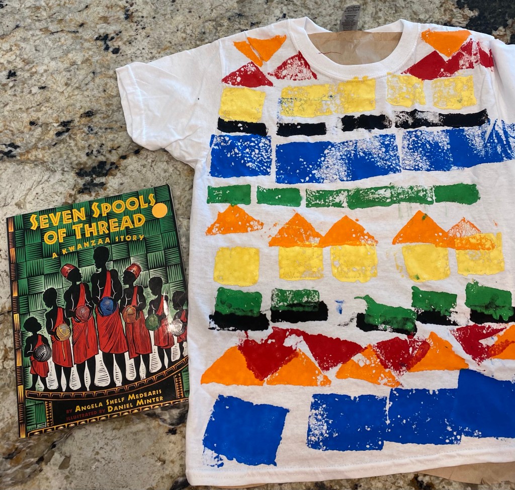Art: Ghana- Sponge painting kente cloth: First we read the story “Seven Spools of Thread”. Then I cut some sponges into shapes- squares, thick and thin rectangles and triangles. I poured some red, orange, yellow, green, blue and black paint on plates and placed one sponge in each color- I used permanent acrylic craft paint so it wouldn’t come out when washed. Then I had my littles use the sponges to make rows of each shape (Walmart only gave us one shirt, so I just had them take turns and it was fine!) to make a kente cloth style shirt like in the story! TIP: This paint does NOT wash out of clothes. Before you begin, strip your little down to his or her diaper (or undies b/c who cares if they get paint on those!) so they don’t end up staining their clothes like mine did! Hastily trying to scrub paint out of fabric while two young kids are hanging out with the rest of said permanent paint is NOT fun! LOL (Hindsight 20/20 am I right?!)