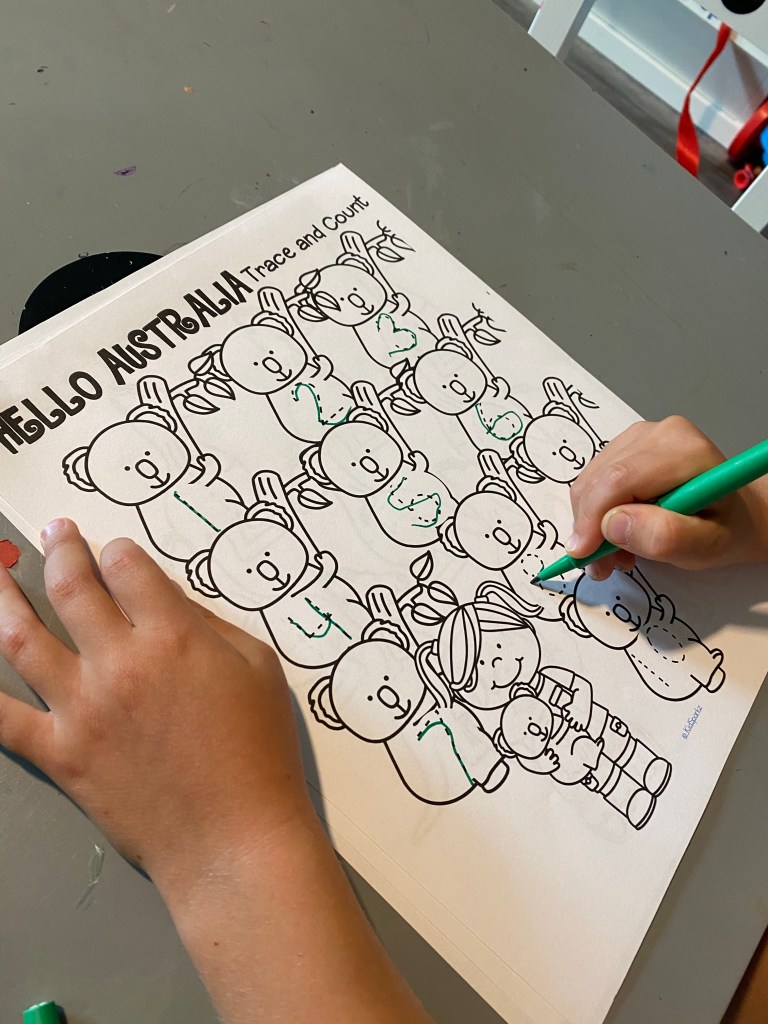 Math: Australian animal number tracing- I printed a set of Australian animal number tracing pages from Kid Sparkz then had my little trace and say the numbers 1-10.