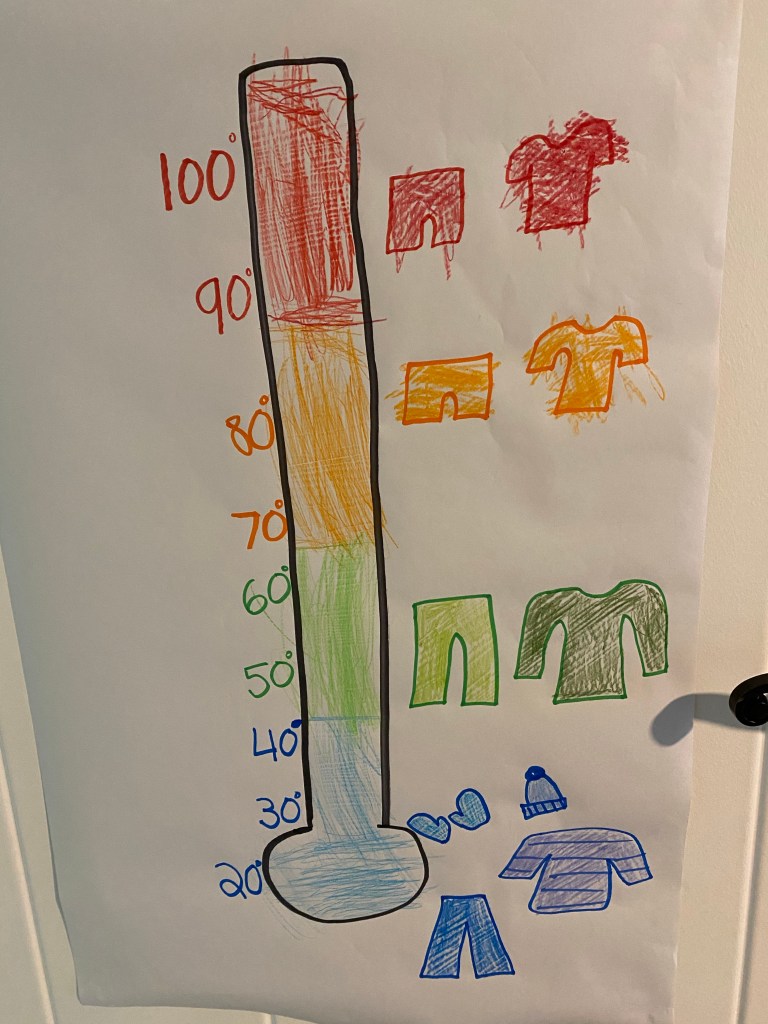 Science/Social studies: Antarctic temperature study- First I asked my little what temperature is. After discussing it we used our digital thermometer to measure the temperature of each other, inside the house, and outside the house. We tried to measure ice too since Antarctica is covered in snow and ice, but the thermometer just kept reading “low” (probably because it’s for measuring people, not the world- it would’ve been better if we’d used an old fashioned mercury thermometer but I didn’t feel like pulling it out of the pool! LoL) Then we discussed the temperature in Antarctica (the average is -67 degrees in the winter in some places!) and how scientists have to dress very warm because the weather is so cold. We extended this knowledge to what we wear at different temperatures to keep our bodies comfortable. Then we made a giant thermometer to hang on his door with temperatures and examples of what to wear in each temperature to stay comfortable. I told my little he could ask Alexa what the weather was each morning, then use that information to find the number on the thermometer and choose what to wear based on that information (a brilliant idea from my friend Kim who was trying to get her little to wear a coat in the winter without a fight!)
