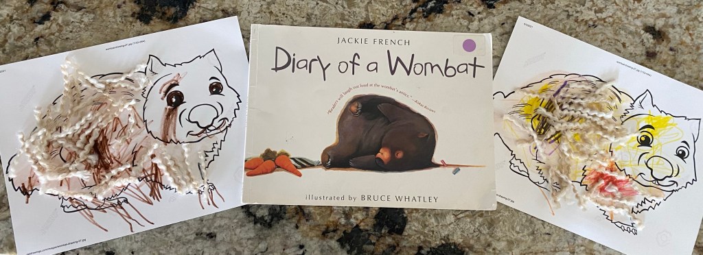 “Diary of a Wombat” story and craft- We read “Diary of a Wombat” then I had my little color wombats I had printed on cardstock. Then we talked about how wombats are mammals and mammals have hair. I painted them with a light layer of decoupage and had my littles glue 1 inch pieces of brown string to them to make them hairy. I got this idea from Danielle’s Place.