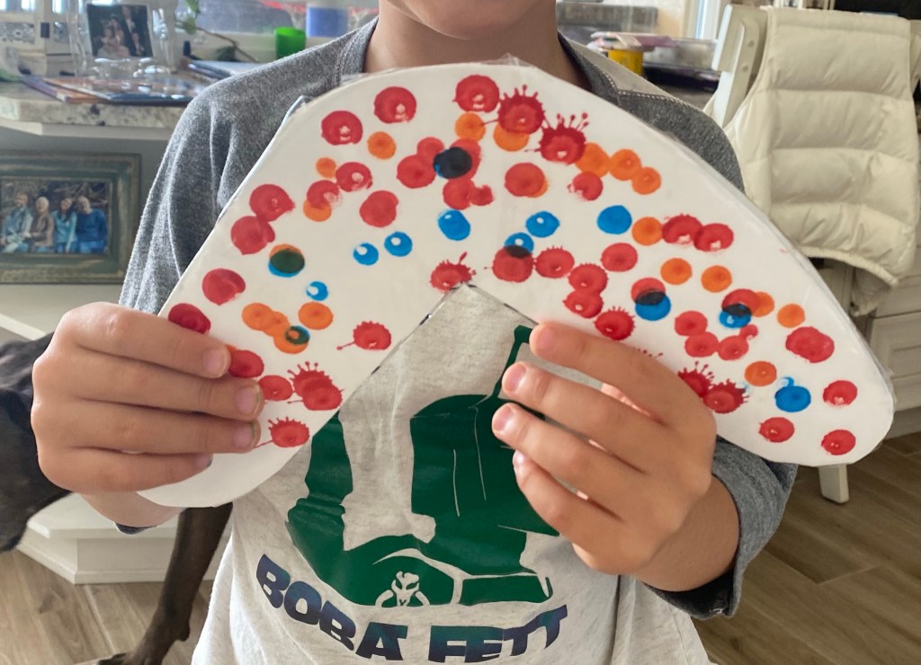 Boomerang craft- We talked about how Aboriginal people- the first people to live in Australia- used boomerangs to hunt with. They would throw them at the animal they were hunting then it would return to the hunter if they missed so they saved time in having to go get their weapon for another throw. Ours didn’t return- but they flew great! To make them, I cut out a boomerang shape (a bit like a wide V with rounded edges) from cardstock and had my littles decorate them with do-a-dot markers. Then I taped them to a piece of thick cardboard in the same shape (you can trace your original then cut it out of the cardboard so they match up) using packing tape. We had a blast throwing them all over the house!