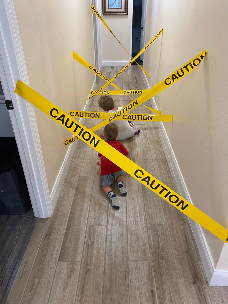 –Caution tape obstacle course: This is such a great activity for a rainy day! My littles ran it countless times again and again! I basically just used caution tape to set up an obstacle course through our house (if you want to see it in action, follow me on Facebook at Little Loves and Learning- I posted a video!) I included a tunnel crawl under the dining room table, a caution tape balance beam (just a strip on the floor they had to walk on), a construction vehicle race with a caution tape finish line, a pillow hop (a row of couch pillows they had to walk on), a caution tape zig zag line, and then the grand finale- a caution tape hallway maze (pictured below)! It took awhile to set up, but it was worth it! I had my littles wait in the playroom to practice patience while I set it up. Make sure you remind your littles before starting to be careful not to tear any of the tape down as they go through (they might still by accident, but at least they won’t be ripping it off the walls for fun!) You may want to demonstrate how to run it first too so they know what to do and where to go.