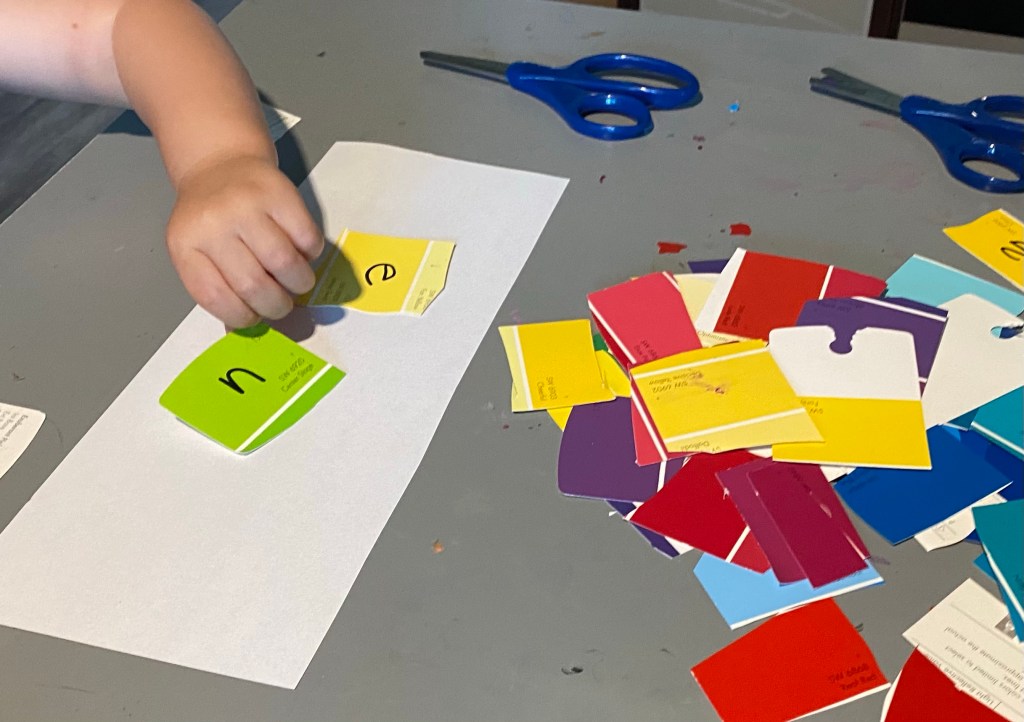 –Paint strip fine motor practice: For this activity I gave my littles some paint sample strips and had them practice cutting them on the white lines. I helped my toddler by holding the strip for him while he cut (he still uses scissors like garden sheers, but I figure that’s a start!) After they had snipped 4 strips each, I had them pick a color for each letter of their name. Then I wrote a letter on each snipped color and had my little find the first letter, then the second and so on and glue them to a piece of paper in order to spell his name. My preschooler wrote his own letters and did his own spelling/gluing. I got this idea from Pocket of Preschool, then added the name practice idea myself!