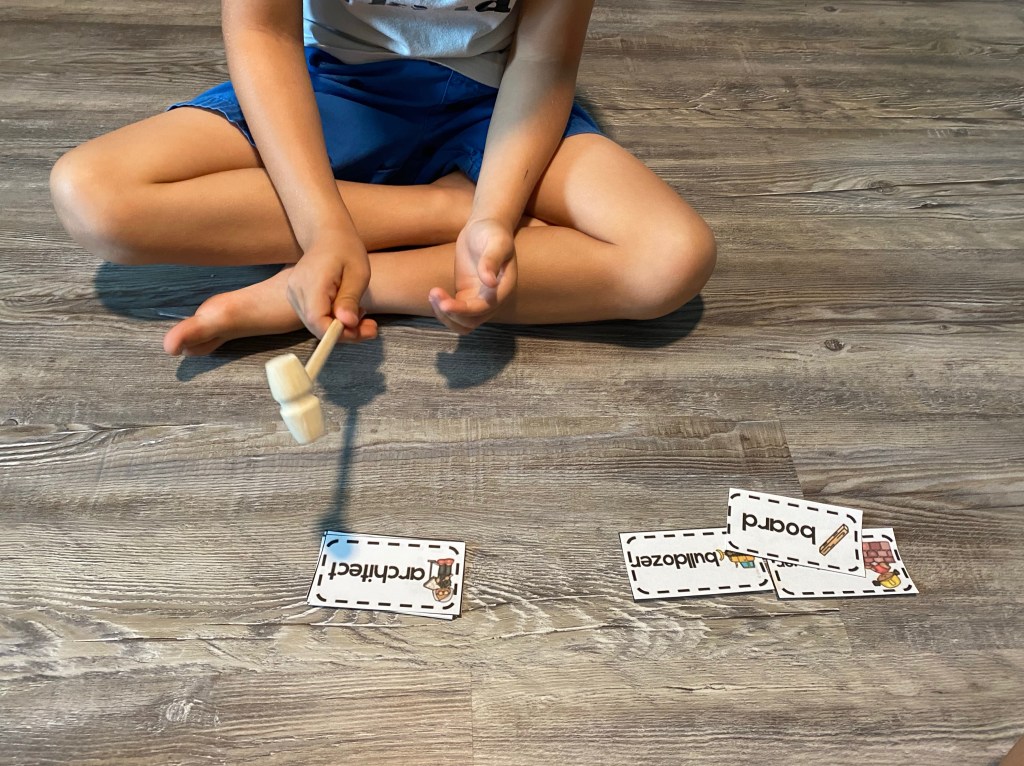 -Hammer the syllables: First I printed some construction words here and here. Then I said each of the letter sounds in the words while pointing to them (they’re a bit long for new readers to sound out on their own) and had my little put them together into a word. Then I had him hammer out the syllables in the word and tell me how many it had- for example “construction” would be 3 taps: con-struc-tion. I got the idea from Pocket of Preschool.