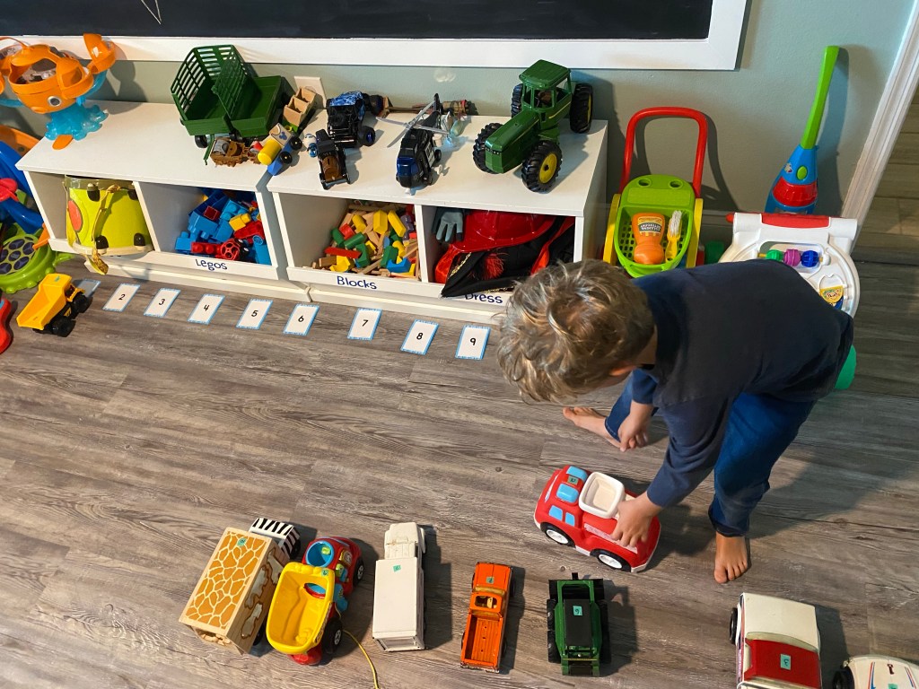 -Construction vehicle parking lot: Firstly- I THOUGHT we had more construction truck toys than we actually do- I know a few are lost because I could only find two! LoL Anyway, workers totally have to drive their own trucks to the job site so we just used regular trucks along with construction vehicles. So back to the activity- you write the numbers 1-10 on washi tape and stick them to the vehicles in a random order. Then place flashcards with numbers 1-10 on the floor in a row like a parking lot. Have your little park the correct vehicle in the correct spot (ie. 1 goes in 1, 2 in 2 and so on).