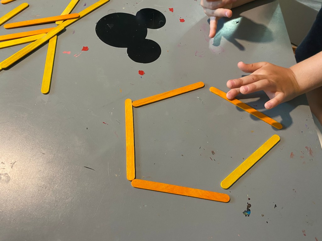 -Building shapes: This was such a great hands-on learning activity and spurred some great math talk between my little and I. I gave my little some orange and yellow popsicle sticks (I bought some colored ones so I didn’t have to spend 10 days painting them! LoL) and had him build a triangle, square, rectangle, parallelogram, rhombus, trapezoid, pentagon, hexagon and octagon. As he built, we talked about how many sides each shape had, what the corners looked like (square or not), and how the shapes he was making had to be connected at the corners and closed to make a space in the middle. After he made his shapes, I made them all again and had him count the sides and tell me what the shape was. I got this idea from Pocket of Preschool.