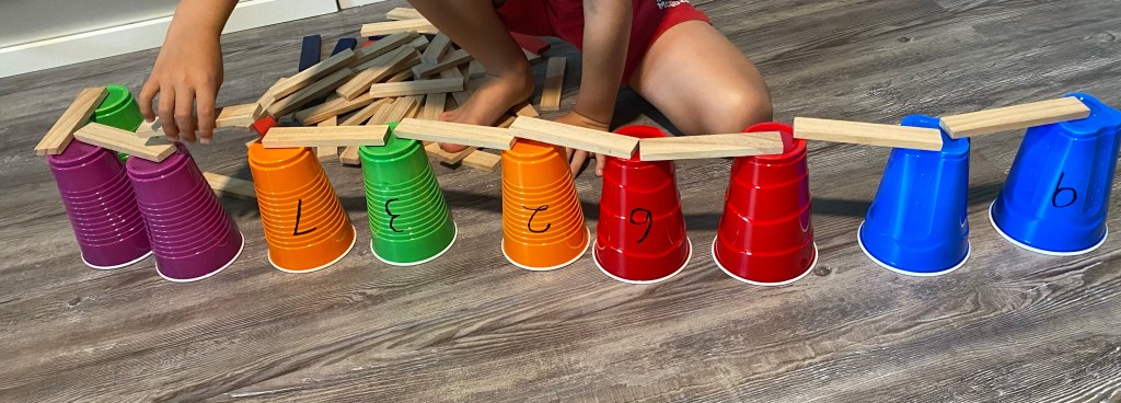 -STEM bridge building: For this activity I told my little to build a bridge and gave him some blocks and solo cups. (If you don’t have long blocks you can also use popsicle sticks.) Since STEM is about not only designing but improving upon design, once he had finished (in about 2.5 seconds LOL) I asked him to look at his bridge and imagine cars were driving along it. I asked him what he could improve to make his bridge a better construction so that it was safer for drivers since that is what real engineers do. He ended up straightening out the blocks so they actually connected and making a smooth, straight road.