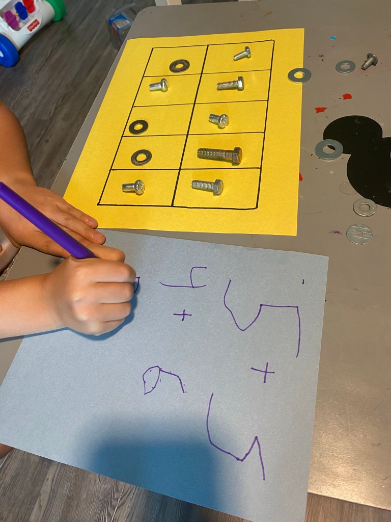-Build ten: I gave my little a ten frame, 10 bolts and 10 washers. Then I asked him to build ten in as many ways as he could. I showed him how first by placing one bolt and 9 washers on the ten frame, then writing down my number of bolts plus my number of washers (1 + 9). Then I had him build ten in as many ways as he could and write down the corresponding addition sentences. I got this idea from Pocket of Preschool.