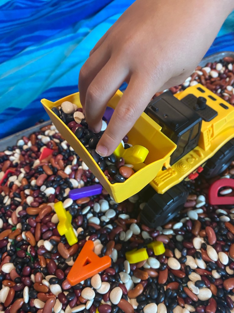 -Construction site letter hunt: I buried our ABC magnets in our sensory play bean mix and had my little use a bucket loader to dig them out and identify them.